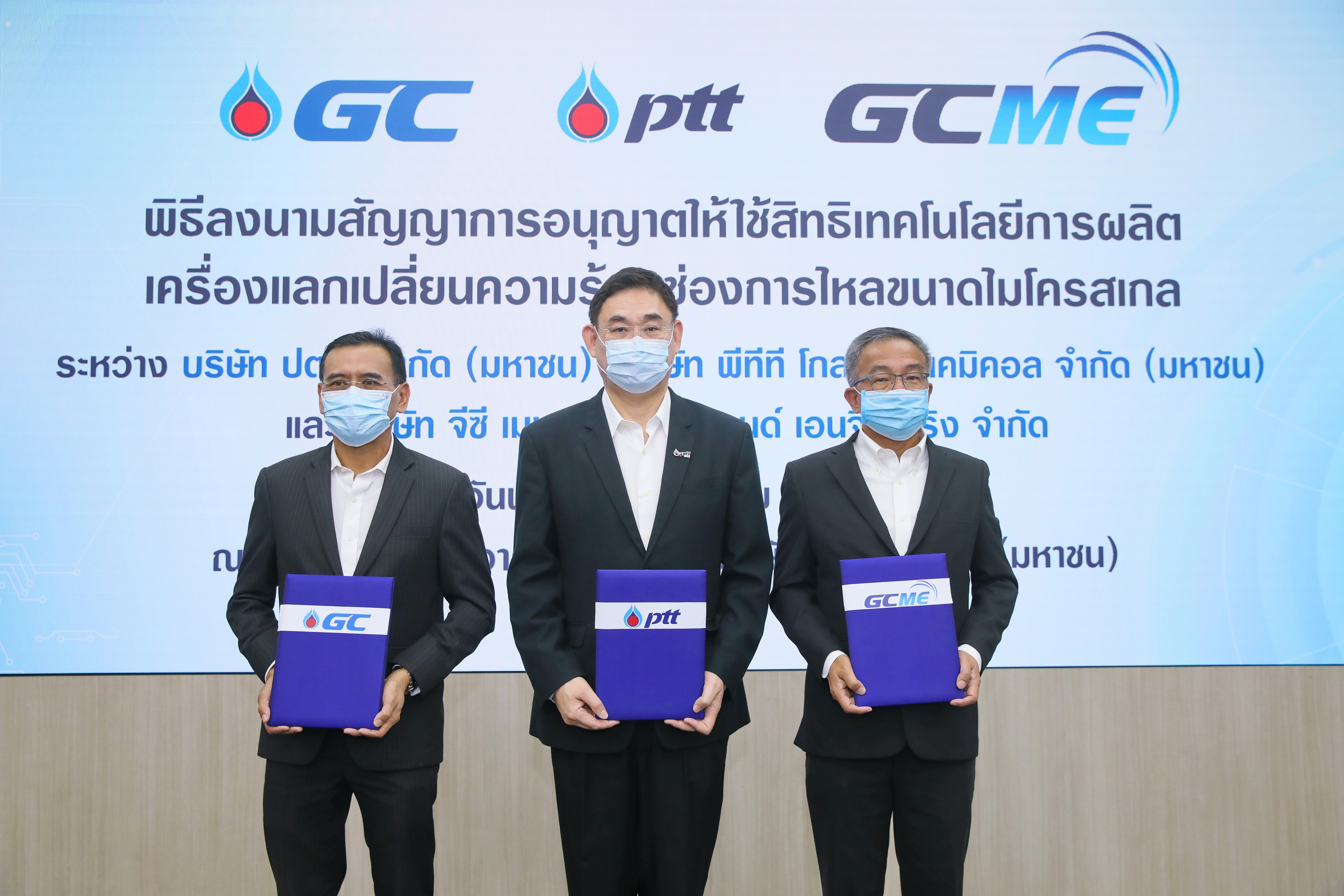 Mr. Worawat Pitayasiri, Senior Executive Vice President, Innovation and Digital, PTT Public Company Limited (PTT) (Center), Mr. Varit Namwong, Chief Operating Officer, Excellence Center at PTT Global Chemical Plc. (PTTGC), Mr. Pairoj Samuttananon (left) Managing Director, GC Maintenance & Engineering Limited (GCME) (Right) signed a license agreement for the production technology of micro flow channel heat exchangers. Microchannel Heat Exchanger can transfer the heat up to 33 per cent higher than conventional heat exchangers. Having high strength and safety, it is 70-90 percent smaller and thus able to be installed in a confined space. This innovation is a joint research between PTT and GC. In order to turn the research into real application, GCME will use the heat exchangers in industries such as petrochemicals, oil & gas, food and beverages, which will create added value for business operations, enhance production technology and contribute to a sustainable growth of country's economy.