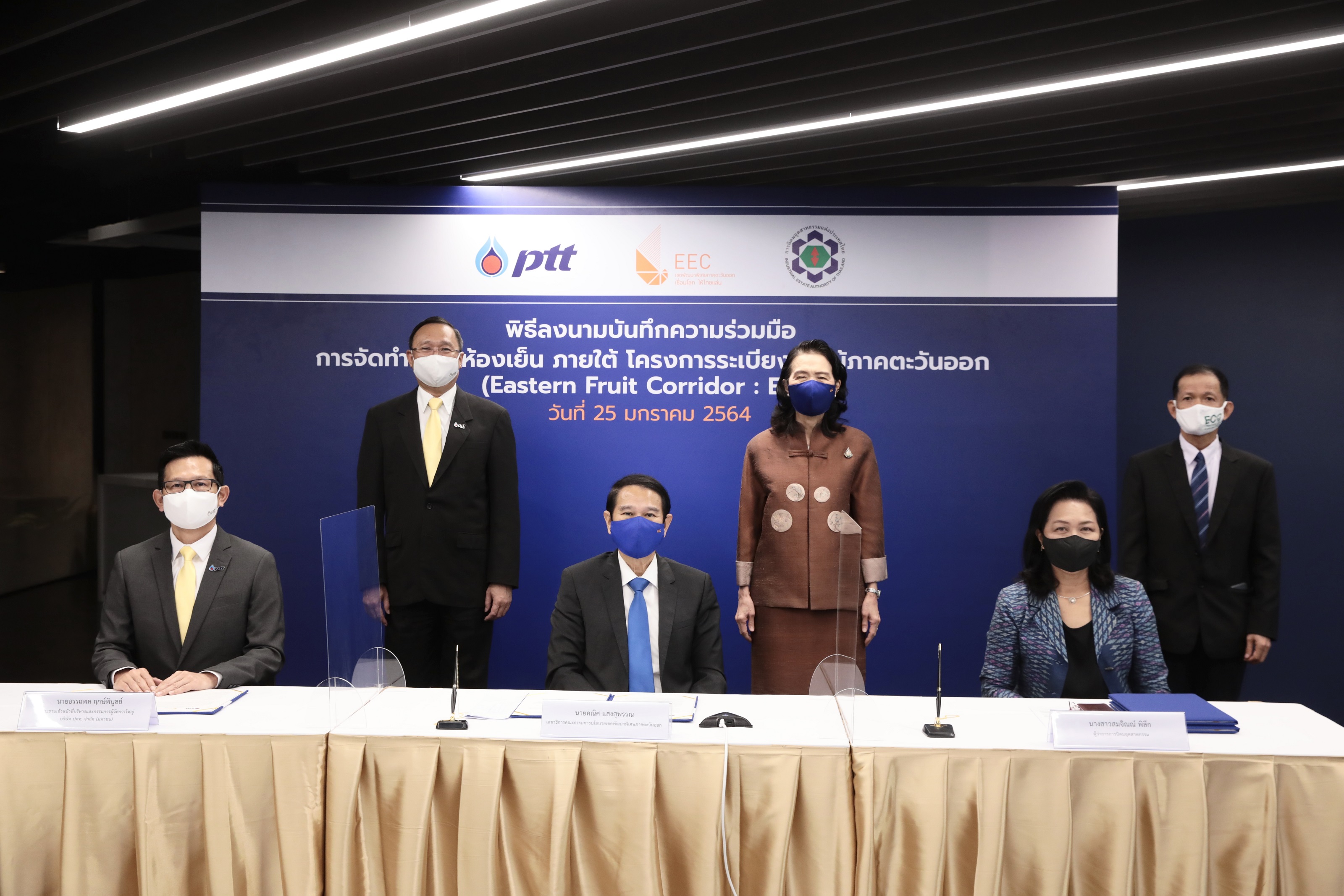 Mr. Auttapol Rerkpiboon, President and Chief Executive Officer, PTT Public Co., Ltd. (PTT), Mr. Kanit Sangsuphan, Secretary-General of the Eastern Economic Corridor Policy Committee and Ms. Somchint Pilouk, Governor of Industrial Estate Authority of Thailand (IEAT) attended the signing ceremony for the Cooperation Agreement in system development of blast freezer & cold storage under the Eastern Fruit Corridor (EFC) project. At the event, Mr. Supattanapong Panmeechao, Deputy Prime Minister and Minister of Energy, Chaired the ceremony which was witnessed by Mr. Suriya Jungrungruangkit, Minister of Industry. Under the cooperation, the cold storage system and infrastructure of the preservation of agricultural products will be developed. PTT will invest on constructing a modern 4,000 - ton cold storage system, utilizing the cold energy from liquefied natural gas (LNG) gasification to produce liquid nitrogen for use in blast freezer which will help maintain the quality of fruits as if they were recently collected from the garden. It will also develop a cold storage system that can maintain the quality of agricultural products for sale all year round. PTT will as well develop a digital platform of partner management system. Meanwhile, IEAT will be responsible for the site allocated in the area of the industrial estate - Smart Park, Map Ta Phut, Rayong Province, and ECC will coordinate the cooperation and promote benefits for public and private agencies. The pilot project will begin with durian and expand to other products to help generate stable income for farmers. The implementation will reduce shortages or oversupply of the produce and will increase the country's economic competitiveness as well as create added value for the Thai agricultural sector to compete internationally in a sustainable manner.