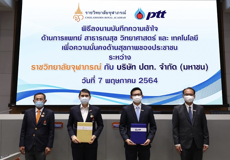 Professor Nithi Mahanonda, M.D., Secretary General of Chulabhorn Royal Academy (CRA) and Mr. Auttapol Rerkpiboon, PTT Public Company Limited (PTT) signed a Memorandum of Understanding (MOU) between Chulabhorn Royal Academy and PTT Public Company Limited at the CRA to create an effective health system and public health security of the country.
