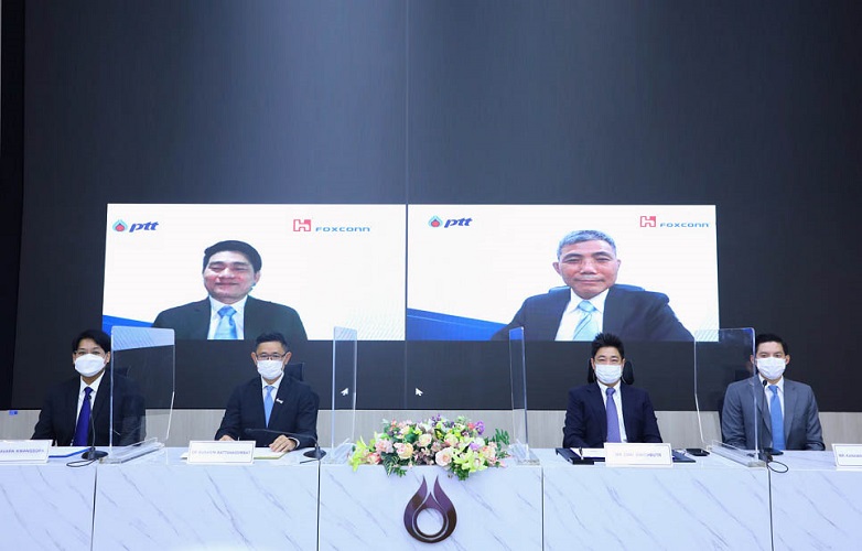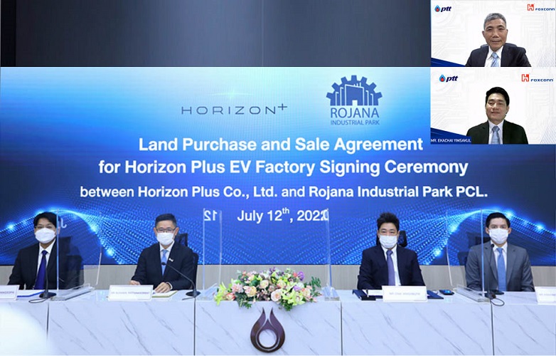 Dr. Buranin Rattanasombat, Senior Executive Vice President, Innovation and New Ventures, PTT Plc., and Chairman of the Board of Director, Horizon Plus Co., Ltd., presided over the Virtual Signing Ceremony of the Land Purchase and Sale Agreement for Horizon Plus EV Factory between Horizon Plus Co., Ltd., and Rojana Industrial Park Public Co.,Ltd. Horizon Plus is a joint venture company by Arun Plus Co.,Ltd., and Hon Hai Technology Group (Foxconn.) The agreement was co-signed by