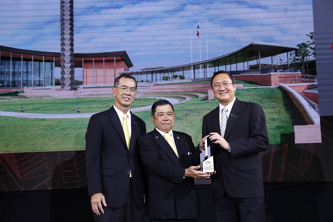 Bangkok, Recently, Mr. Wittawat Svasti-xuto (right), Chief Technology and Engineering Officer, and Mr. Worapong Nakchatree (left), Manager of Engineering and Construction Management, Wang Chan Valley Area Development Project for the Eastern Economic Corridor Innovation Zone (EECi), PTT Public Company Limited (PTT) received the Thai Contractor Award 2019 from Mr. Aungsurat Areekul (center), President of the Thai Contractors Association under the Royal Patronage at the “Future Construction: BUILT TO LAST” held on the occasion of the 90th anniversary at Athenee Hotel, Bangkok. "Wang Chan Valley Area Development Project" in Rayong province consisting of Vidyasirimedhi Institute of Science and Technology (VISTEC), Kamnoetvidya Science Academy (KVIS), and the Wang Chan reforestation project benefits the construction industry both in terms of project patterns, construction technology, management for efficiency and effectiveness. The project promotes safety and good environment for society, community, as well as create a sustainability for the country.