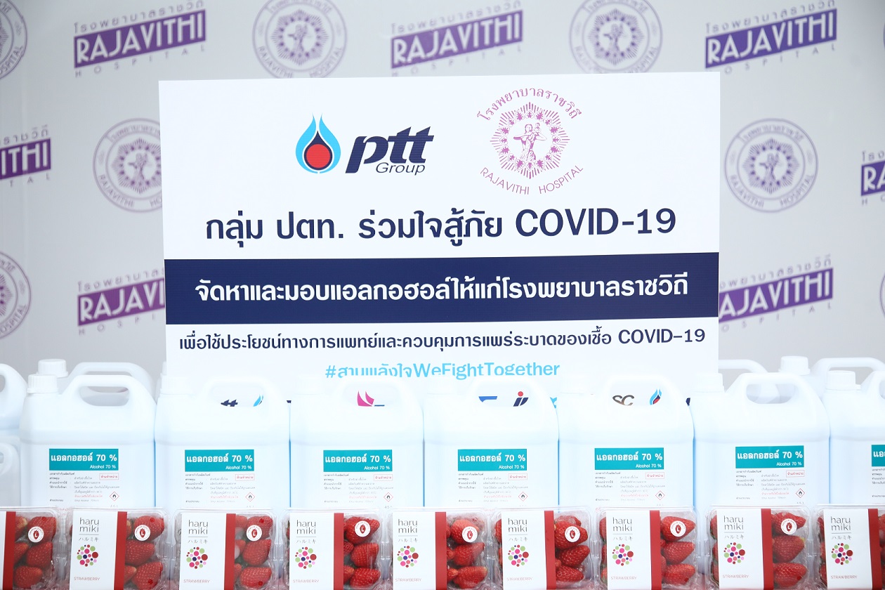 On March 31, 2020, Mr. Chansin Treenuchagron, President and Chief Executive Officer, PTT Public Company Limited (PTT) delivered alcohol procured from domestic alcohol production facilities and additional supply including 70 % alcohol, alcohol gels and disinfectant sprays to Rajavithi Hospital. Dr. Somkiat Lalitwongsa, M.D., Director of Rajavithi Hospital (RJVH) as a representative received the products which will be used to control the spread of COVID-19. In addition, PTT Group has offered Harumiki Strawberries, produce grown from the cold energy from Liquefied Natural Gas (LNG) gasification to boost morale of diligent healthcare workers who have continuously worked very hard.