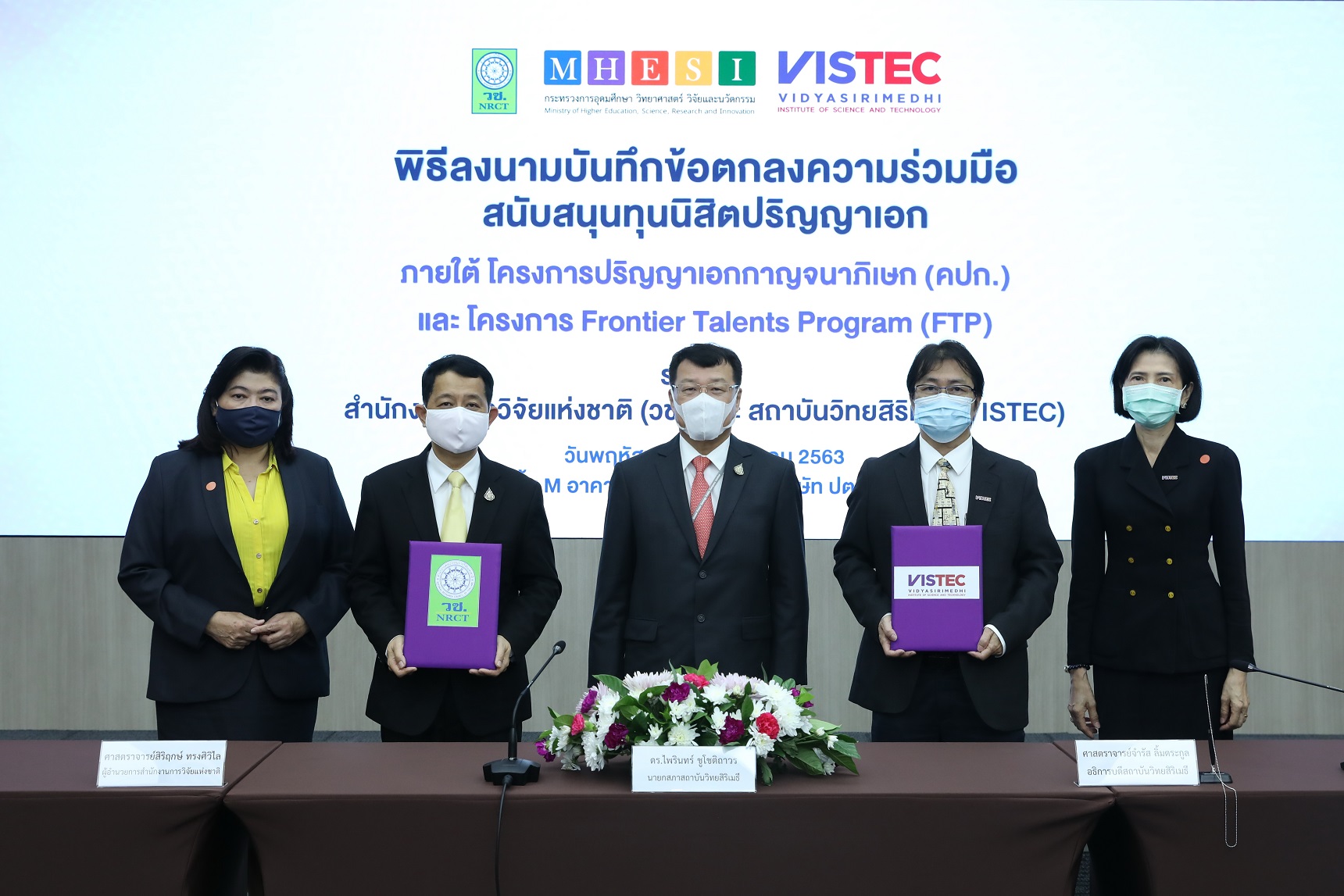 ดร.ไพรินทร์ ชูโชติถาวร นายกสภาสถาบันวิทยสิริเมธี เป็นสักขีพยานผู้ทรงเกียรติ ในพิธีลงนามบันทึกข้อตกลงความร่วมมือสนับสนุนทุนนิสิตปริญญาเอกภายใต้โครงการปริญญาเอกกาญจนาภิเษก (คปก.) และโครงการ Frontier Talents Program (FTP) ระหว่างสำนักงานการวิจัยแห่งชาติ (วช.) และ สถาบันวิทยสิริเมธี (VISTEC) โดยมีศาสตราจารย์ นายแพทย์สิริฤกษ์ ทรงศิวิไล เลขาธิการคณะกรรมการวิจัยแห่งชาติ ทำหน้าที่ ผู้อำนวยการสำนักงานการวิจัยแห่งชาติ และศาสตราจารย์ ดร.จำรัส ลิ้มตระกูล อธิการบดีสถาบันวิทยสิริเมธี เป็นผู้ลงนามของทั้งสองฝ่าย วัตถุประสงค์เพื่อมุ่งพัฒนานักวิจัยระดับปริญญาเอกที่มีความเป็นเลิศด้านวิทยาศาสตร์และเทคโนโลยีเทียบเท่าระดับนานาชาติ ต่อยอดสู่การสร้างสรรค์นวัตกรรมชั้นแนวหน้าศาสตราจารย์ นายแพทย์สิริฤกษ์ ทรงศิวิไล เลขาธิการคณะกรรมการวิจัยแห่งชาติ กล่าวว่า โครงการปริญญาเอกกาญจนาภิเษก (คปก.) เป็นโครงการที่ให้ทุนสนับสนุนการวิจัยให้แก่นิสิต นักศึกษาที่ต้องการศึกษาต่อในระดับปริญญาเอก เพื่อผลิตผลงานวิจัยที่มีประโยชน์ต่อภาคเศรษฐกิจ สังคม และวิชาการของประเทศ รวมถึงส่งเสริมให้มีนักวิจัยระดับปริญญาเอกของไทยที่มีคุณภาพสูง และเกิดเครือข่ายความร่วมมือระหว่างนักวิจัย และสถาบันการศึกษาทั้งในประเทศและต่างประเทศ โดยได้เริ่มดำเนินการมาตั้งแต่ปี พ.ศ. 2541 และปัจจุบันเป็นรุ่นที่ 22 โดย วช. และ VISTEC จะร่วมสนับสนุนทุนนิสิตปริญญาเอกภายใต้ คปก. และ FTP โดยเริ่มจากผู้ได้รับทุน คปก. รุ่นที่ 22 ซึ่งมีเป้าหมายสำคัญเพื่อสร้างนิสิตปริญญาเอกที่มีศักยภาพ และสามารถผลิตผลงานคุณภาพสูง ที่อยู่ในฐานข้อมูล Nature Index, ISI หรือ SCOPUS ในอันดับสูงสุดร้อยละ 10 (Tier 1) ส่งเสริมให้เกิดการนำความรู้ขั้นสูง สร้างแรงจูงใจ สู่การสร้างสรรค์ผลิตภัณฑ์ที่สร้างมูลค่าตอบโจทย์อุตสาหกรรมหลักของประเทศ