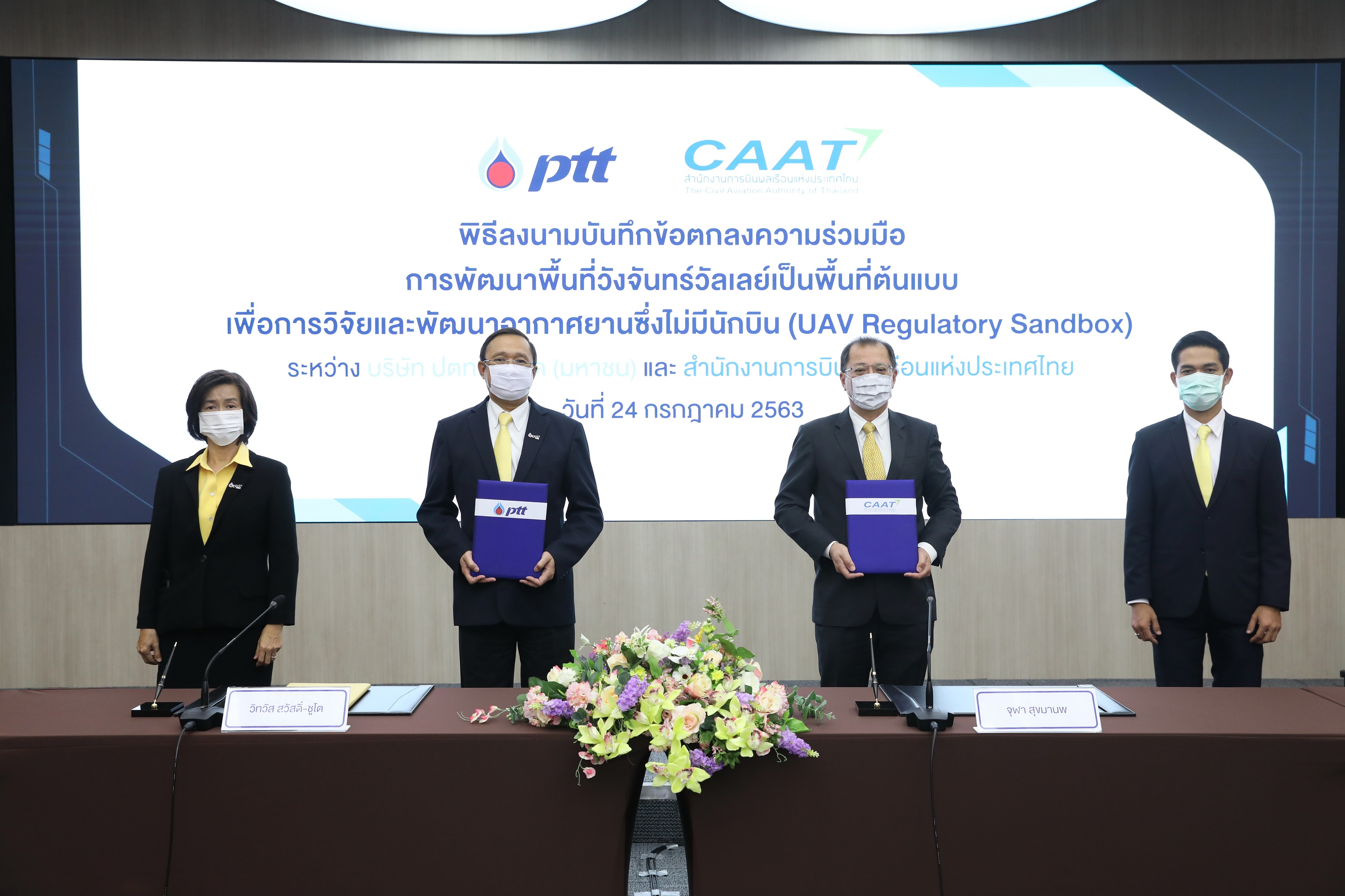 นายวิทวัส สวัสดิ์-ชูโต ประธานเจ้าหน้าที่เทคโนโลยีและวิศวกรรม บริษัท ปตท. จำกัด (มหาชน) (ที่ 2 จากซ้าย) และ ดร.จุฬา สุขมานพ ผู้อำนวยการสำนักงานการบินพลเรือนแห่งประเทศไทย (ที่ 2 จากขวา) เป็นประธานในพิธีลงนามบันทึกข้อตกลงความร่วมมือการพัฒนาพื้นที่ EECi@วังจันทร์วัลเลย์ เป็นพื้นที่ต้นแบบเพื่อการวิจัยและพัฒนาอากาศยานไร้คนขับ (UAV Regulatory Sandbox) ระหว่าง บริษัท ปตท. จำกัด (มหาชน) และ สำนักงานการบินพลเรือนแห่งประเทศไทย โดยมี นางเบญญาภรณ์ จารุจินดา ผู้อำนวยการโครงการพัฒนาพื้นที่วังจันทร์วัลเลย์ เพื่อเขตนวัตกรรมระเบียงเศรษฐกิจพิเศษภาคตะวันออก บริษัท ปตท. จำกัด (มหาชน) (ซ้าย) และ นายบันเทิง เมฆฉาย ผู้จัดการฝ่ายพิธีการบิน สำนักงานการบินพลเรือนแห่งประเทศไทย (ขวา) ร่วมลงนาม เพื่อมุ่งสร้างการเปลี่ยนแปลงตามนโยบาย Thailand 4.0 และสอดคล้องกับการดำเนินยุทธศาสตร์เชิงรุกของสำนักงานการบินพลเรือนแห่งประเทศไทย อีกทั้งเป็นการเปิดโอกาสให้แก่ผู้สนใจ ผู้ผลิต นักลงทุน ตลอดจนผู้เกี่ยวข้องในห่วงโซ่คุณค่า (Value Chain) ได้ทดสอบ ทดลอง เพื่อการวิจัยและพัฒนาธุรกิจอากาศยานไร้คนขับ เป็นที่แรกของประเทศไทย ในพื้นที่ EECi@วังจันทร์วัลเลย์ จ.ระยอง