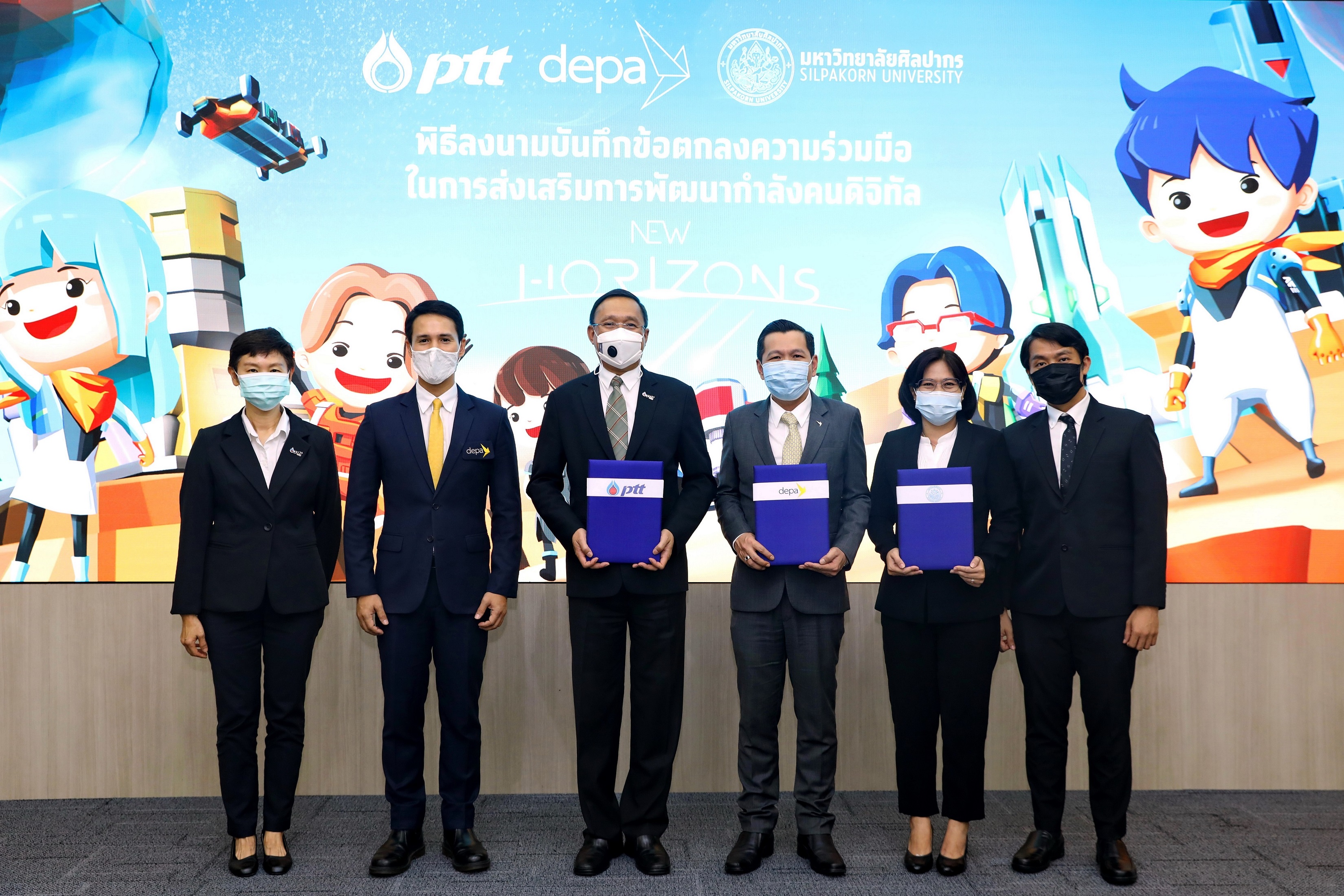 นายวิทวัส สวัสดิ์-ชูโต ประธานเจ้าหน้าที่เทคโนโลยีและวิศวกรรม บริษัท ปตท. จำกัด (มหาชน) (ที่ 3 จากซ้าย) ผู้ช่วยศาสตราจารย์ ดร. ณัฐพล นิมมานพัชรินทร์ ผู้อำนวยการสำนักงานส่งเสริมเศรษฐกิจดิจิทัล (ที่ 3 จากขวา) และผู้ช่วยศาสตราจารย์ ดร.ณัฐพร กาญจนภูมิ คณบดีคณะเทคโนโลยีสารสนเทศและการสื่อสาร มหาวิทยาลัยศิลปากร (ที่ 2 จากขวา) ร่วมลงนามสัญญาการส่งเสริมและสนับสนุนให้เกิดการพัฒนากำลังคนดิจิทัล สอดคล้องกับการพัฒนาทักษะแห่งศตวรรษที่ 21 และทักษะดิจิทัลที่เกี่ยวข้องในกลุ่มเยาวชน ด้วยสื่อการเรียนการสอนรูปแบบใหม่ผ่าน “เกม New Horizons” ซึ่งเป็นผลงานที่ได้รับการพัฒนาโดย ปตท. เพื่อสร้างทักษะ สร้างกิจกรรมการเรียนรู้ในรูปแบบ Interactive-learning และส่งเสริมความรู้ความเข้าใจในอุตสาหกรรมดิจิทัลและธุรกิจพลังงาน โดยความร่วมมือและการสนับสนุนจากสำนักงานส่งเสริมเศรษฐกิจดิจิทัล และมหาวิทยาลัยศิลปากร มีเป้าหมายเปิดโอกาสให้นักเรียนเข้าร่วมโครงการผ่านกิจกรรมดังกล่าวกว่า 2,500 คน นับเป็นการสร้างนวัตกรรมการเรียนรู้รูปแบบใหม่ที่เข้าถึงง่าย พร้อมช่วยขับเคลื่อนการศึกษาของประเทศ