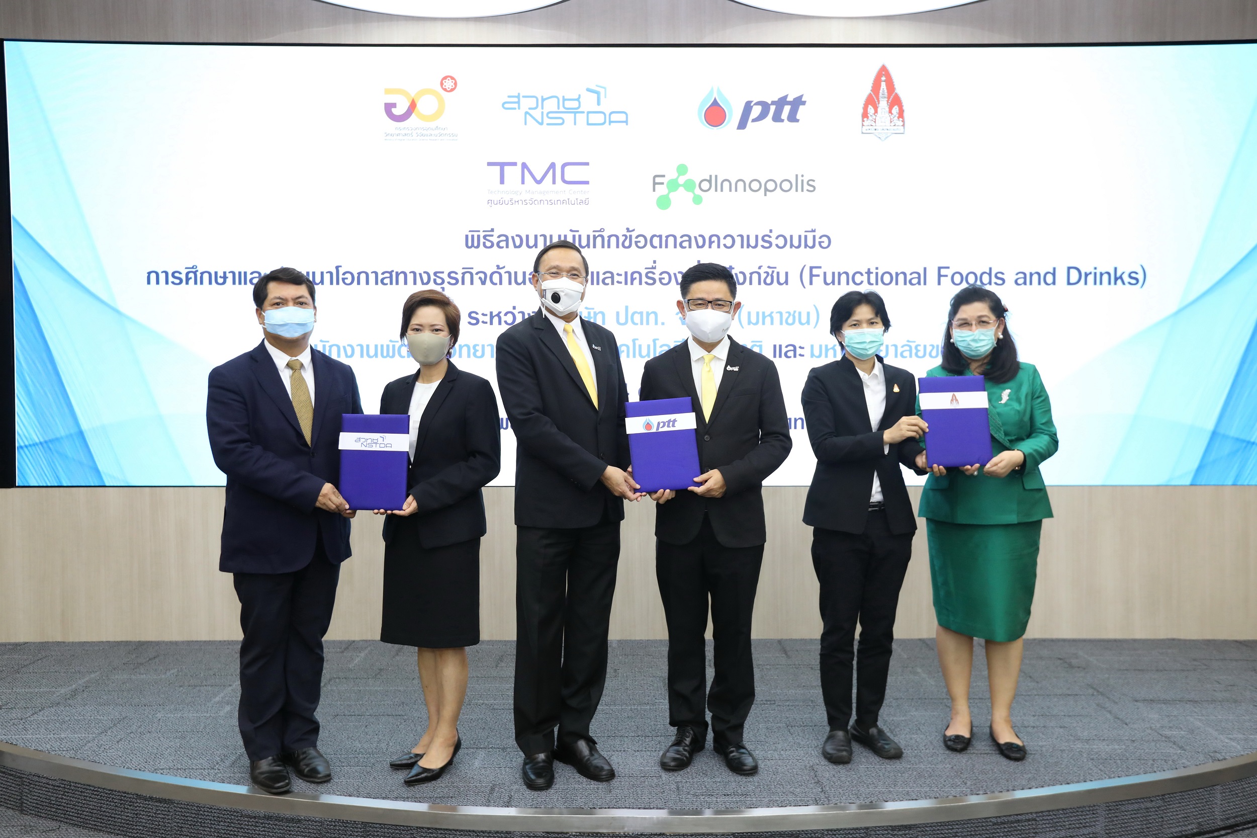 นายวิทวัส สวัสดิ์-ชูโต ประธานเจ้าหน้าที่เทคโนโลยีและวิศวกรรม บริษัท ปตท. จำกัด (มหาชน) (ปตท.) (ที่ 3 จากซ้าย) เป็นประธานในพิธีลงนามบันทึกข้อตกลงความร่วมมือการศึกษาและพัฒนาโอกาสทางธุรกิจด้านอาหารและเครื่องดื่มเพื่อสุขภาพ (Functional Foods & Drinks) ระหว่าง บริษัท ปตท. จำกัด (มหาชน) สำนักงานพัฒนาวิทยาศาสตร์และเทคโนโลยีแห่งชาติ (สวทช.) โดยศูนย์บริหารจัดการเทคโนโลยี และมหาวิทยาลัยขอนแก่น โดยมี ดร.บุรณิน รัตนสมบัติ รองกรรมการผู้จัดการใหญ่ กลุ่มธุรกิจปิโตรเลียมขั้นปลาย ปตท. (ที่ 3 จากขวา) ดร.ฐิตาภา สมิตินนท์ ผู้อำนวยการ ศูนย์บริหารจัดการเทคโนโลยี (ที่ 2 จากซ้าย) ผศ.ดร.อัครวิทย์ กาญจนโอภาษ ผู้ช่วยผู้อำนวยการ สวทช. ด้านเมืองนวัตกรรมอาหาร (ซ้าย) ศ.ดร.ธิดารัตน์ บุญมาศ รองอธิการบดีฝ่ายนวัตกรรมและวิสาหกิจ มหาวิทยาลัยขอนแก่น (ที่ 2 จากขวา) และ ศ.ดร.จินตนาภรณ์ วัฒนธร ผู้อำนวยการสถาบันวิจัยเพื่อพัฒนาสมรรถนะมนุษย์และการเสริมสร้างสุขภาพ มหาวิทยาลัยขอนแก่น (ขวา) ร่วมลงนาม โดยมุ่งพัฒนาโอกาสทางธุรกิจ เพื่อสร้างสรรค์นวัตกรรมอาหารและเครื่องดื่มสุขภาพที่ปลอดภัยและมีคุณภาพ ครอบคลุมกระบวนการตั้งแต่ต้นน้ำจนถึงปลายน้ำ ตลอดจนส่งเสริมภูมิปัญญา สร้างมูลค่าเพิ่มสินค้าเกษตร และขับเคลื่อนประเทศสู่ศูนย์กลางนวัตกรรมอาหารอย่างยั่งยืน