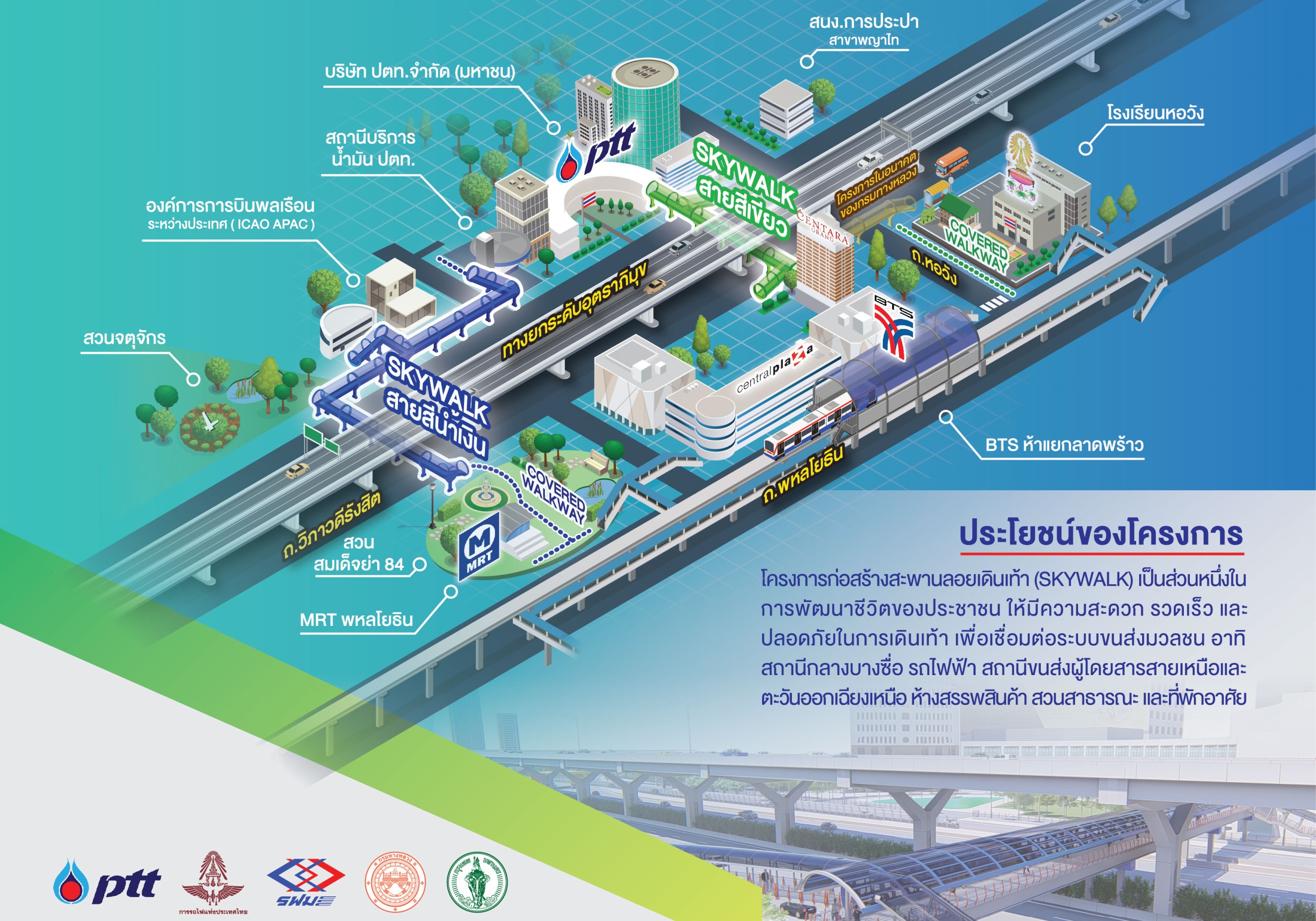นายไกรฤทธิ์ อุชุกานนท์ชัย ประธานกรรมการบริษัท ปตท. จำกัด (มหาชน) (ที่ 3 จากขวา) นายอรรถพล ฤกษ์พิบูลย์ ประธานเจ้าหน้าที่บริหารและกรรมการผู้จัดการใหญ่ บริษัท ปตท. จำกัด (มหาชน) (ที่ 3 จากซ้าย) นายภคพงศ์ ศิริกันทรมาศ ผู้ว่าการการรถไฟฟ้าขนส่งมวลชนแห่งประเทศไทย (ที่ 2 จากซ้าย) นายนิรุฒ มณีพันธ์ ผู้ว่าการการรถไฟแห่งประเทศไทย (ซ้าย) ดร.มนตรี เดชาสกุลสม ผู้อำนวยการสำนักงานทางหลวงที่ 13 กรมทางหลวง (ที่ 2 จากขวา) และ นายประพาส เหลืองศิรินภา รองผู้อำนวยการสำนักการจราจรและขนส่ง รักษาราชการแทนผู้อำนวยการสำนักการจราจรและขนส่ง กรุงเทพมหานคร (ขวา) ร่วมเปิดโครงการสานพลังความร่วมมือ สร้าง “สกายวอล์ค” เชื่อมระบบขนส่งมวลชน เพื่อสาธารณประโยชน์ โดยแบ่งเป็น 2 โครงการ สายสีเขียว ปรับปรุงสะพานลอยเดินเท้า เชื่อมจากสำนักงานใหญ่ ปตท. ไปยังรถไฟฟ้าสถานีห้าแยกลาดพร้าว และ สายสีน้ำเงิน ก่อสร้างสะพานลอยเดินเท้าจากสถานีบริการน้ำมัน ปตท. สำนักงานใหญ่ ไปสิ้นสุดที่รถไฟฟ้าสถานีพหลโยธิน โดยมีเป้าหมายให้ประชาชนในพื้นที่กรุงเทพมหานคร สามารถเดินทางได้อย่างสะดวก รวดเร็ว และปลอดภัย เชื่อมโยงระบบขนส่งสาธารณะทางราง เพิ่มประสิทธิภาพการจราจรให้มีความคล่องตัวยิ่งขึ้น โดยคาดว่าโครงการจะพร้อมให้บริการประชาชนภายในปี 2564
