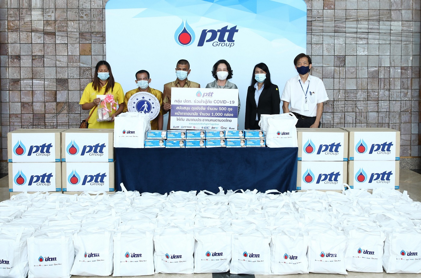 นางกนกพร รอดรุ่งเรือง ผู้ช่วยกรรมการผู้จัดการใหญ่บริหารชื่อเสียงองค์กรและกิจการเพื่อสังคม บริษัท ปตท. จำกัด (มหาชน) (กลางขวา) ในฐานะผู้แทนกลุ่ม ปตท. มอบการสนับสนุนโครงการช่วยเหลือคนตาบอดที่ได้รับผลกระทบจากโรคโควิด – 19 ของสมาคมประชาคมคนตาบอดไทย โดยมี นายพัฒน์ธนชัย สระกวี นายกสมาคมประชาคมคนตาบอดไทย (กลางซ้าย) เป็นผู้รับมอบ ประกอบด้วย ถุงยังชีพจำนวน 500 ถุง และหน้ากากอนามัย จำนวน 1,000 กล่อง รวมมูลค่ากว่า 3 แสนบาท เพื่อร่วมบรรเทาผลกระทบและค่าใช้จ่ายของผู้พิการทางการมองเห็น ที่ไม่สามารถประกอบอาชีพได้ตามปกติ เป็นการส่งเสริมคุณภาพชีวิตของประชาชนทุกกลุ่ม ให้สังคมไทยก้าวผ่านวิกฤตินี้ไปด้วยกัน #สานพลังใจWeFightTogether