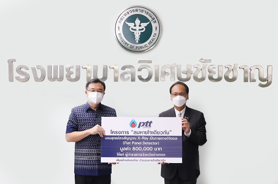 เมื่อเร็ว ๆ นี้ - นายเทอดเกียรติ พร้อมมูล รองกรรมการผู้จัดการใหญ่บริหารองค์กรและ ความยั่งยืน บริษัท ปตท.จำกัด (มหาชน) มอบเครื่องรับสัญญาณภาพเอกซเรย์เป็นดิจิทัล (Flat Panel Detector) มูลค่า 800,000 บาท ภายใต้โครงการลมหายใจเดียวกัน แก่ นายขจรเกียรติ รักพานิชมณี ผู้ว่าราชการจังหวัดอ่างทอง เพื่อใช้เอกซเรย์ปอดแก่ผู้ป่วยติดเชื้อโควิด-19 ในจังหวัดอ่างทอง เพิ่มศักยภาพการรักษาผู้ป่วยและร่วมดูแลประชาชนในพื้นที่