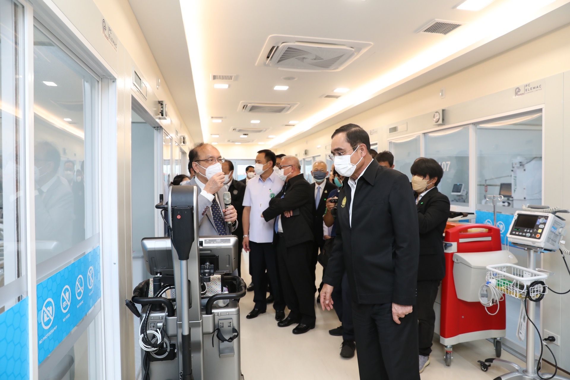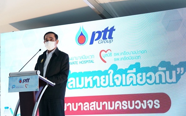 พลเอก ประยุทธ์ จันทร์โอชา นายกรัฐมนตรี ลงพื้นที่ตรวจเยี่ยมโรงพยาบาลสนาม ICU สำหรับผู้ป่วยโควิด19 ระดับสีแดง ในโครงการลมหายใจเดียวกัน กลุ่ม ปตท. บนพื้นที่ 4 ไร่ ด้านหน้าโรงพยาบาลปิยะเวท เขตห้วยขวาง กรุงเทพฯ พร้อมด้วย นายสุพัฒนพงษ์ พันธ์มีเชาว์ รองนายกรัฐมนตรีและรัฐมนตรีว่าการกระทรวงพลังงาน นายอนุทิน ชาญวีรกูล รองนายกรัฐมนตรีและรัฐมนตรีว่าการกระทรวงสาธารณสุข พลเอก อนุพงษ์ เผ่าจินดา รัฐมนตรีว่าการกระทรวงมหาดไทย โดยมี ศาสตราจารย์พิเศษ ดร.ทศพร ศิริสัมพันธ์ ประธานกรรมการ ปตท. นายอรรถพล ฤกษ์พิบูลย์ ประธานเจ้าหน้าที่บริหารและกรรมการผู้จัดการใหญ่ บริษัท ปตท. จำกัด (มหาชน) พญ.เจรียง จันทรกมล ประธานเจ้าหน้าที่บริหารโรงพยาบาลในเครือบางปะกอก-ปิยะเวท นพ.วิทิต อรรถเวชกุล กรรมการผู้จัดการบริษัท โรงพยาบาลปิยะเวท จำกัด (มหาชน) พร้อมคณะผู้บริหาร ให้การต้อนรับ
