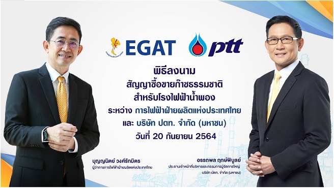 วันนี้ (20 กันยายน 2564) นายอรรถพล ฤกษ์พิบูลย์ ประธานเจ้าหน้าที่บริหารและกรรมการผู้จัดการใหญ่ บริษัท ปตท. จำกัด (มหาชน) (ปตท.) และ นายบุญญนิตย์ วงศ์รักมิตร ผู้ว่าการการไฟฟ้าฝ่ายผลิตแห่งประเทศไทย (กฟผ.) ร่วมลงนามสัญญาซื้อขายก๊าซธรรมชาติสำหรับโรงไฟฟ้าน้ำพองฉบับใหม่ ระยะเวลา 10 ปี (2564 – 2574) มูลค่ากว่า 53,000 ล้านบาท เสริมสร้างความมั่นคงทางพลังงาน เพิ่มขีดความสามารถการพัฒนาภาคตะวันออกเฉียงเหนือ พร้อมรองรับการขยายตัวทางเศรษฐกิจของประเทศ