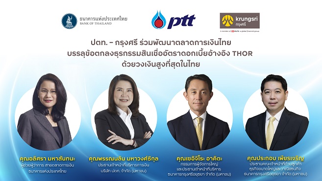 ธนาคารแห่งประเทศไทย (ธปท.) ร่วมแสดงความยินดีในโอกาสที่ บริษัท ปตท. จำกัด (มหาชน) (ปตท.) บรรลุข้อตกลงให้ กรุงศรี (ธนาคารกรุงศรีอยุธยา จำกัด (มหาชน)) เป็นพันธมิตรผู้สนับสนุนสินเชื่อธุรกิจของ ปตท. ด้วยอัตราดอกเบี้ยอ้างอิง THOR (Thai Overnight Repurchase Rate) วงเงิน 6,000 ล้านบาท เป็นระยะเวลา 5 ปี ซึ่งเป็นวงเงินที่สูงที่สุดนับตั้งแต่ ธปท. ประกาศใช้อัตราดอกเบี้ย THOR เป็นอัตราดอกเบี้ยอ้างอิงใหม่ของไทย ถือเป็นธุรกรรมการเงินครั้งสำคัญของ ปตท. และกรุงศรี ที่จะสร้างความเชื่อมั่นและขับเคลื่อนตลาดการเงินไทยนางสาวพรรณนลิน มหาวงศ์ธิกุล ประธานเจ้าหน้าที่บริหารการเงิน บริษัท ปตท. จำกัด (มหาชน) เปิดเผยว่า “ปตท. ยินดีร่วมสนับสนุนเสถียรภาพและพัฒนาตลาดการเงินตามนโยบายธนาคารแห่งประเทศไทย ร่วมกับธนาคารกรุงศรีอยุธยา พันธมิตรทางธุรกิจและทางการเงินที่ดีมาโดยตลอดของ ปตท. ซึ่งในครั้งนี้ ปตท. ได้บรรลุข้อตกลงรับการสนับสนุนวงเงินสินเชื่อ 6,000 ล้านบาท กับธนาคารกรุงศรีอยุธยา ด้วยอัตราดอกเบี้ยอ้างอิง THOR เป็นระยะเวลา 5 ปี เพื่อเป็นการต่อยอดและส่งเสริมการนำอัตราดอกเบี้ย THOR ไปใช้ให้เป็นที่รู้จักในวงกว้างมากขึ้น หลังจากเมื่อเดือนสิงหาคมที่ผ่านมา ปตท. ประสบความสำเร็จจากการออกหุ้นกู้ภาคเอกชนที่อ้างอิง THOR เป็นรายแรก ทั้งนี้ ธุรกรรมสินเชื่อครั้งนี้ถือเป็นการกลับมาระดมทุนผ่านสินเชื่อสกุลเงินบาทกับธนาคารพาณิชย์อีกครั้งในระยะเวลามากกว่า 10 ปี ของ ปตท. สำหรับเงินทุนที่จัดหาได้ในครั้งนี้จะนำไปใช้บริหารต้นทุนทางการเงิน เพื่อการดำเนินธุรกิจและสนับสนุนแผนการเติบโตไปสู่ธุรกิจพลังงานอนาคตและธุรกิจใหม่ที่ไปไกลกว่าพลังงานตามวิสัยทัศน์ “Powering Life with Future Energy and Beyond”