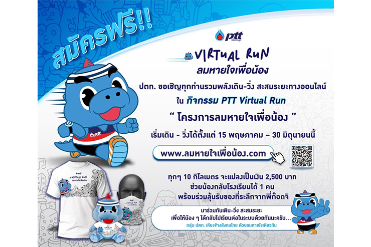 ผู้ที่สนใจเข้าร่วมกิจกรรม PTT Virtual Run เดินวิ่งสะสมระยะทาง สามารถสมัครผ่านทาง www.ลมหายใจเพื่อน้อง.com ตั้งแต่วันที่ 15 พฤษภาคม – 30 มิถุนายนนี้ พร้อมลุ้นรับของที่ระลึกจากก๊อดจิ โดยไม่มีค่าใช้จ่าย