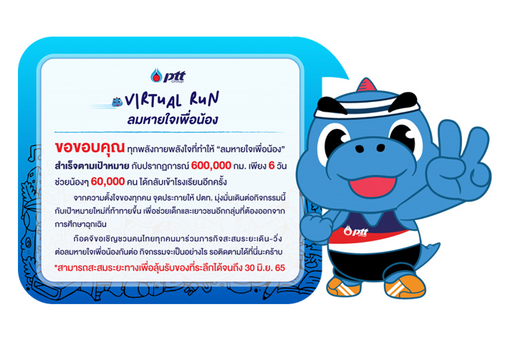 ปตท. ขอบคุณคนไทย สร้างสถิติ “PTT Virtual Run” เดิน-วิ่ง 600,000 กม. 6 วัน เพื่อน้อง 60,000 คน ต่อลมหายใจกลับโรงเรียน