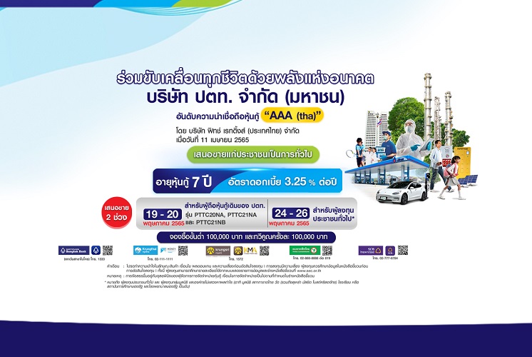 ปตท. พร้อมออกและเสนอขายหุ้นกู้อายุ 7 ปี สำหรับผู้ลงทุนประชาชนทั่วไป อัตราดอกเบี้ย 3.25% ต่อปี กำหนดจ่ายดอกเบี้ยทุก 6 เดือน ด้วยอันดับความน่าเชื่อถือที่ระดับ AAA (tha) จากบริษัท ฟิทช์ เรทติ้งส์ (ประเทศไทย) จำกัด ซึ่งเป็นระดับสูงที่สุดสำหรับตราสารหนี้ที่ออกในประเทศไทย สามารถจองซื้อหุ้นกู้ได้ในระหว่างวันที่ 24-26 พฤษภาคม 2565 โดยกำหนดจองซื้อขั้นต่ำ 100,000 บาท ทวีคูณครั้งละ 100,000 บาท ไม่จำกัดมูลค่าการจองซื้อ (ยกเว้นยอดจองซื้อเต็มตามวงเงินที่บริษัทต้องการออก) ผ่านสถาบันการเงิน 5 แห่ง ได้แก่ ธนาคารกรุงเทพ ธนาคารกรุงไทย ธนาคารกรุงศรีอยุธยา ธนาคารกสิกรไทย และธนาคารไทยพาณิชย์ ผ่านทั้งช่องทางสาขาของธนาคารและช่องทางออนไลน์