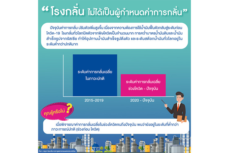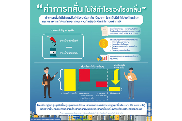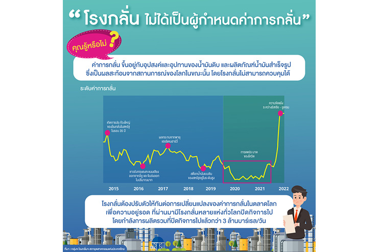 ทั้งนี้ สืบเนื่องจากมีประชาชนส่วนมาก ยังมีความเข้าใจผิดเรื่อง “ค่าการกลั่นน้ำมันที่สูงขึ้น” กลุ่มฯ โรงกลั่นฯ ได้จัดทำ Infographic เพื่อสร้างความเข้าใจและประชาสัมพันธ์ได้โดยสะดวก (ตามเอกสารแนบ) ในประเด็นต่อไปนี้