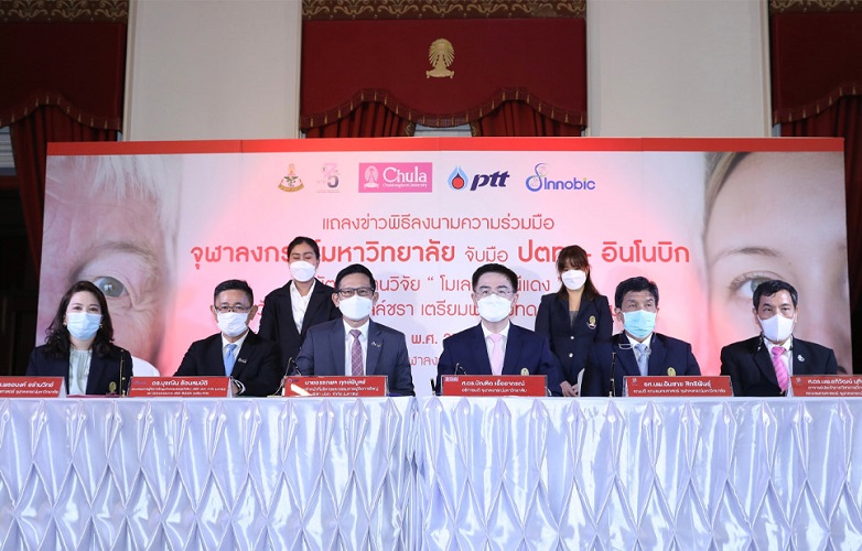 วันนี้ (12 กรกฎาคม พ.ศ. 2565) ศ.ดร.บัณฑิต เอื้ออาภรณ์ อธิการบดี จุฬาฯ พร้อมด้วย นายอรรถพล ฤกษ์พิบูลย์ ประธานเจ้าหน้าที่บริหารและกรรมการผู้จัดการใหญ่ บริษัท ปตท. จำกัด (มหาชน) ดร.บุรณิน รัตนสมบัติ รองกรรมการผู้จัดการใหญ่นวัตกรรมและธุรกิจใหม่ บริษัท ปตท. จำกัด (มหาชน) และ ประธานกรรมการ บริษัท อินโนบิก (เอเซีย) จำกัด รศ.นพ.ฉันชาย สิทธิพันธุ์ คณบดี คณะแพทยศาสตร์ จุฬาฯ ศ.ภญ.ดร.พรอนงค์ อร่ามวิทย์ คณบดี คณะเภสัชศาสตร์ จุฬาฯ และ ศ.นพ.อภิวัฒน์ มุทิรางกูร อาจารย์ประจำคณะกายวิภาคศาสตร์ คณะแพทยศาสตร์ จุฬาฯ ร่วมกันแถลงข่าว จุฬาฯ จับมือ ปตท. - อินโนบิก พัฒนางานวิจัย ‘โมเลกุลมณีแดง’ นวัตกรรมต้านเซลล์ชรา เตรียมพร้อมทดสอบในมนุษย์ เพื่อแถลงความคืบหน้าล่าสุดของการพัฒนาและวิจัยโมเลกุลมณีแดง หรือ RED–GEMs ที่พร้อมทดสอบในมนุษย์ และการเตรียมความพร้อมในกระบวนการผลิตโมเลกุลมณีแดงสู่สังคม โดยภายในงานมีพิธีลงนามความร่วมมือเพื่อสนับสนุนการวิจัยและการผลิตนวัตกรรม ‘มณีแดง’ ระหว่าง จุฬาลงกรณ์มหาวิทยาลัย ซึ่งดำเนินงานโดย คณะแพทยศาสตร์ และคณะเภสัชศาสตร์ ร่วมกับ บริษัท ปตท. จำกัด (มหาชน) และ บริษัท อินโนบิก (เอเซีย) จำกัด โดยมี พญ.กอบกุลยา จึงประเสริฐศรี เป็นผู้ดำเนินรายการ เมื่อเวลา 11.00 น. ณ ห้อง 111 อาคารมหาจุฬาลงกรณ์ จุฬาลงกรณ์มหาวิทยาลัย