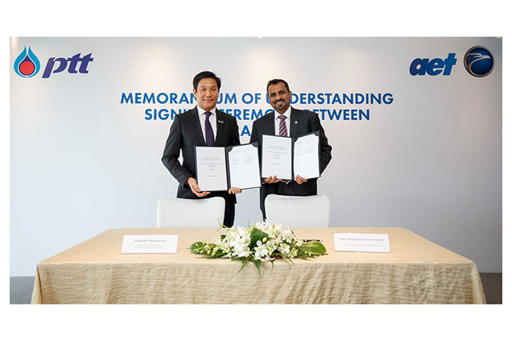 นายดิษทัต ปันยารชุน รองกรรมการผู้จัดการใหญ่ หน่วยธุรกิจการค้าระหว่างประเทศ บริษัท ปตท. จำกัด (มหาชน) (ซ้าย) ลงนามในบันทึกข้อตกลงความร่วมมือศึกษา พัฒนาและสร้างเรือขนส่ง Zero-Emission Aframax ร่วมกับ Mr. Rajalingam Subramaniam AET President & CEO and MISC Group COO (ขวา) เพื่อร่วมกันศึกษาความเป็นไปได้ รวมถึงพัฒนา และสร้างเรือบรรทุกน้ำมันที่ปล่อยมลพิษเป็นศูนย์ ขนาด Aframax (ขนาดประมาณ 120,000 เมตริกตัน) ชนิดเชื้อเพลิงคู่ (Dual Fuel) คือสามารถใช้เชื้อเพลิงได้ทั้งกรีนแอมโมเนียและน้ำมันเตากำมะถันต่ำ จํานวน 2 ลํา ซึ่งหากการศึกษามีความเป็นไปได้ เรือลำแรกจะมีกําหนดส่งมอบให้กับ ปตท. เพื่อดำเนินการเช่าเหมาลําในไตรมาสที่ 4 ปี 2568 และลำที่สองในไตรมาสที่ 1 ปี 2569