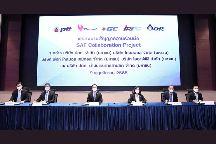 วันนี้ (9 พฤศจิกายน 2565) นายนพดล ปิ่นสุภา ประธานเจ้าหน้าที่ปฏิบัติการกลุ่มธุรกิจปิโตรเลียมขั้นปลาย บริษัท ปตท. จำกัด (มหาชน) เป็นประธานในพิธีลงนามบันทึกข้อตกลงความร่วมมือในการศึกษา พัฒนาและลงทุนผลิตน้ำมันเชื้อเพลิงอากาศยานชีวภาพแบบยั่งยืน (Sustainable Aviation Fuel : SAF) ระหว่างบริษัท ปตท. จำกัด (มหาชน) โดย นายจตุรงค์ วรวิทย์สุรวัฒนา ผู้ช่วยกรรมการผู้จัดการใหญ่แผนกลุ่มธุรกิจปิโตรเลียมขั้นปลาย บริษัท ไทยออยล์ จำกัด (มหาชน) (Thai Oil) โดย นายรัฐกร กัมปนาทแสนยากร รองกรรมการผู้จัดการใหญ่ ด้านกลยุทธ์องค์กร บริษัท พีทีที โกลบอล เคมิคอล จำกัด (มหาชน) (GC) โดย นางวราวรรณ ทิพพาวนิช รองกรรมการผู้จัดการใหญ่ สายงานกลยุทธ์องค์กร บริษัท ไออาร์พีซี จำกัด (มหาชน) (IRPC) โดย นายสมเกียรติ เลิศฤทธิ์ภูวดล รองกรรมการผู้จัดการใหญ่ กลยุทธ์ แผนและพัฒนาธุรกิจองค์กร และ บริษัท ปตท. น้ำมันและการค้าปลีก จำกัด (มหาชน) (OR) โดย นายทรงพล เทพนำโสมนัสส์ รองประธานเจ้าหน้าที่บริหารด้านธุรกิจเอนเนอร์ยี่โซลูชัน ร่วมลงนาม