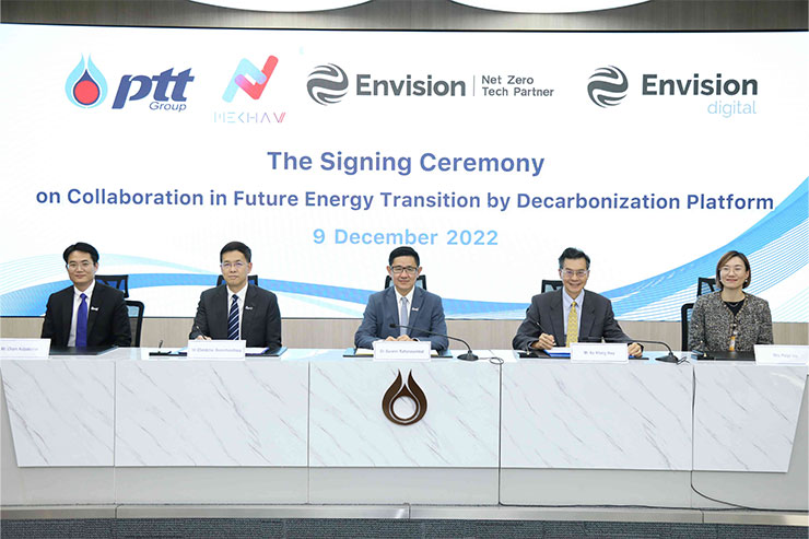 บริษัท ปตท. จำกัด (มหาชน) และ ENVISION DIGITAL INTERNATIONAL PTE. LTD. บริษัทชั้นนำด้านการพัฒนาซอฟต์แวร์เพื่อลดคาร์บอน ภายใต้กลุ่มบริษัท Envision ร่วมลงนามบันทึกความเข้าใจ (MOU) Collaboration in Future Energy Transition by Decarbonization Platform ศึกษาและทดลองการใช้งานแพลตฟอร์มบริหารจัดการพลังงานอัจฉริยะ ภายในพื้นที่ของกลุ่ม ปตท. เพื่อบริหารและลดการปล่อยก๊าซเรือนกระจก ขับเคลื่อนเป้าหมายการปล่อยก๊าซเรือนกระจกสุทธิเป็นศูนย์ (Net Zero Emissions) ภายในปี 2050 โดยมี ดร. บุรณิน รัตนสมบัติ ประธานเจ้าหน้าที่ปฏิบัติการกลุ่มธุรกิจใหม่และโครงสร้างพื้นฐาน คุณเชิดชัย บุญชูช่วย รองกรรมการผู้จัดการใหญ่นวัตกรรมและธุรกิจใหม่ บริษัท ปตท. จำกัด (มหาชน) และ Mr. Ko Kheng Hwa ประธานกรรมการ Envision Digital ร่วมในพิธีลงนาม
