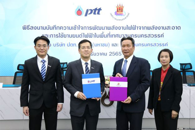 นายเชิดชัย บุญชูช่วย รองกรรมการผู้จัดการใหญ่นวัตกรรมและธุรกิจใหม่ บริษัท ปตท. จำกัด (มหาชน) (ที่ 2 จากซ้าย) พร้อมด้วย นายชาญ กุลภัทรนิรันดร์ ผู้ช่วยกรรมการผู้จัดการใหญ่พัฒนาธุรกิจใหม่ บริษัท ปตท. จำกัด (มหาชน) (ซ้าย) นายจิตตเกษมณ์ นิโรจน์ธนรัฐ นายกเทศมนตรีนครนครสวรรค์ (ที่ 2 จากขวา) และ นางสุณี มังคลารัตนศรี ปลัดเทศบาลนครนครสวรรค์ (ขวา) ร่วมลงนามบันทึกความเข้าใจการพัฒนาพลังงานไฟฟ้าจากพลังงานสะอาด และการใช้ยานยนต์ไฟฟ้าในพื้นที่เทศบาลนครนครสวรรค์ ระหว่าง บริษัท ปตท. จำกัด (มหาชน) และ เทศบาลนครนครสวรรค์ ผ่านการพัฒนาโครงการติดตั้งระบบผลิตพลังงานไฟฟ้าจากพลังงานแสงอาทิตย์ เพื่อเป็นการใช้พลังงานสะอาดและช่วยลดค่าใช้จ่ายจากการใช้พลังงานไฟฟ้า โดยความร่วมมือดังกล่าวจะติดตั้งระบบผลิตไฟฟ้าพลังงานแสงอาทิตย์แบบลอยน้ำ (Solar Floating) และแบบติดตั้งบนหลังคา (Solar Rooftop) ในพื้นที่ความรับผิดชอบของเทศบาลนครนครสวรรค์ พร้อมระบบบริหารจัดการพลังงานที่ได้จากระบบผลิตไฟฟ้าจากพลังงานแสงอาทิตย์ ตลอดจนการสนับสนุนให้มีการเปลี่ยนรถยนต์ที่ใช้ในกิจการของหน่วยงานจากชนิดเครื่องยนต์สันดาปภายในมาเป็นยานยนต์ไฟฟ้า (EV) พร้อมติดตั้งเครื่องอัดประจุไฟฟ้า (EV Charger) และระบบการใช้งานที่เกี่ยวข้อง เพื่อช่วยลดค่าใช้จ่ายในการขนส่งเดินทาง และลดมลภาวะจากการเผาไหม้จากเครื่องยนต์ อันจะเป็นส่วนช่วยในการผลักดันให้เทศบาลนครนครสวรรค์เป็นส่วนหนึ่งของการขับเคลื่อนประเทศไทยสู่การเป็นสังคมคาร์บอนต่ำ มีความพร้อมในด้าน Smart Energy และ Smart Mobility สำหรับการเป็นโครงการต้นแบบและนำร่องการก้าวเข้าสู่เมืองอัจฉริยะ (Smart City) ของจังหวัดนครสวรรค์ และสามารถเป็นแหล่งเรียนรู้แก่ชุมชนอื่น ๆ ที่สนใจเพื่อพัฒนาคุณภาพสังคม ชุมชน และสิ่งแวดล้อมให้เติบโตได้อย่างยั่งยืนร่วมกันต่อไป