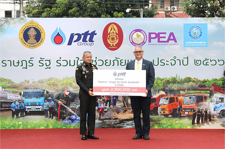 สำหรับการสนับสนุนในปี 2566 ปตท. สนับสนุนผลิตภัณฑ์น้ำมันเชื้อเพลิง บัตรเติมน้ำมัน PTT Privilege Card มูลค่า 2,100,000 บาท ถังบรรจุน้ำสะอาด Innoplus ซึ่งผลิตโดย บริษัท พีทีที โกลบอล เคมิคอล จำกัด (มหาชน) ที่มีความคงทนแข็งแรง น้ำหนักเบา ทนแรงกระแทกสูงเมื่อเทียบกับพลาสติกทั่วไป ทนทานต่อสภาพแวดล้อมและสภาพอากาศได้ดี ขนาด 1,500 ลิตร จำนวน 100 ถัง มูลค่า 500,000 บาท รวมทั้งค่าใช้จ่ายในการประชาสัมพันธ์และดำเนินงานโครงการฯ เพื่อช่วยเหลือพี่น้องประชาชนที่ประสบปัญหาภัยแล้ง ทั้งนี้ตั้งแต่ปี 2542 กลุ่ม ปตท. ได้สนับสนุนโครงการ “ราษฎร์ รัฐ ร่วมใจ ช่วยภัยแล้ง” ช่วยผู้ประสบภัยแล้งทั่วประเทศมากว่า 24 ปี รวมเป็นเงินทั้งสิ้นกว่า 96 ล้านบาท