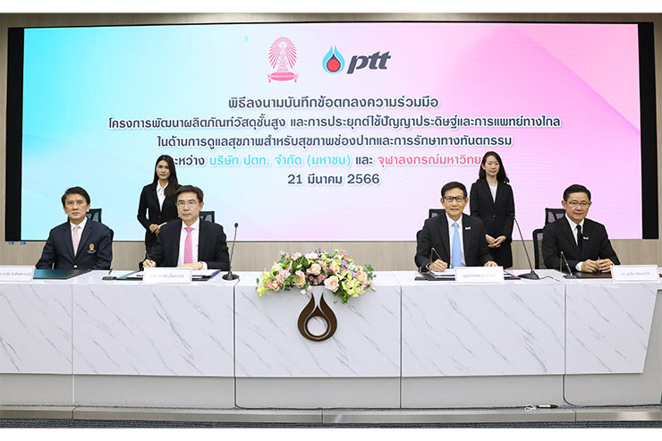 วานนี้ (21 มีนาคม 2566) – นายอรรถพล ฤกษ์พิบูลย์ ประธานเจ้าหน้าที่บริหารและกรรมการผู้จัดการใหญ่ บริษัท ปตท. จำกัด (มหาชน) (ที่ 2 จากขวา) พร้อมด้วย ศ.ดร.บัณฑิต เอื้ออาภรณ์ อธิการบดี จุฬาลงกรณ์มหาวิทยาลัย (ที่ 2 จากซ้าย) ศ.ทพ.ดร.พรชัย จันศิษยานนท์ คณบดี คณะทันตแพทยศาสตร์ จุฬาลงกรณ์มหาวิทยาลัย (ซ้าย) และ ดร.บุรณิน รัตนสมบัติ ประธานเจ้าหน้าที่ปฏิบัติการกลุ่มธุรกิจใหม่และโครงสร้างพื้นฐาน บริษัท ปตท. จำกัด (มหาชน) (ขวา) ร่วมพิธีลงนามบันทึกข้อตกลงความร่วมมือโครงการพัฒนาผลิตภัณฑ์วัสดุชั้นสูงและการประยุกต์ใช้ปัญญาประดิษฐ์ และการแพทย์ทางไกลในด้านการดูแลสุขภาพสำหรับสุขภาพช่องปากและการรักษาทางทันตกรรม ระหว่าง บริษัท ปตท. จำกัด (มหาชน) และ คณะทันตแพทยศาสตร์ จุฬาลงกรณ์มหาวิทยาลัย