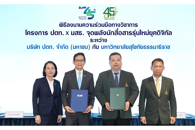 นายอรรถพล ฤกษ์พิบูลย์ ประธานเจ้าหน้าที่บริหารและกรรมการผู้จัดการใหญ่ บริษัท ปตท. จำกัด (มหาชน) พร้อมด้วย รองศาสตราจารย์ ดร.มานิตย์ จุมปา กรรมการสภามหาวิทยาลัยผู้ทรงคุณวุฒิ ร่วมลงนามในพิธีลงนามบันทึกข้อตกลงความร่วมมือทางวิชาการ ปตท. X มสธ. จุดพลังนักสื่อสารรุ่นใหม่ยุคดิจิทัล ระหว่าง บริษัท ปตท. จำกัด (มหาชน) และ มหาวิทยาลัยสุโขทัยธรรมาธิราช เพื่อสร้างโอกาส พัฒนาทรัพยากรมนุษย์ และสนับสนุนให้ประชาชนกลุ่มเป้าหมายเข้าถึงการศึกษาที่มีคุณภาพ ผ่านการเรียนการสอนด้านนิเทศศาสตร์ ในระดับปริญญาตรีและการฝึกอบรมระยะสั้น อันนำไปสู่การพัฒนานักสื่อสารยุคดิจิทัลที่มีวิสัยทัศน์ในการขับเคลื่อนเศรษฐกิจ สังคม และชุมชน ให้พัฒนาอย่างสร้างสรรค์และยั่งยืน โดยมีนางกนกพร รอดรุ่งเรือง ผู้ช่วยกรรมการผู้จัดการใหญ่บริหารชื่อเสียงองค์กรและกิจการเพื่อสังคม บริษัท ปตท. จำกัด (มหาชน) และ ผู้ช่วยศาสตราจารย์ ดร.กานต์ บุญศิริ ประธานกรรมการประจำสาขาวิชานิเทศศาสตร์ ร่วมลงนาม ณ บริษัท ปตท. จำกัด (มหาชน) สำนักงานใหญ่