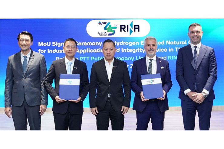 เมื่อเร็วๆ นี้ – ม.ล. ปีกทอง ทองใหญ่ รองกรรมการผู้จัดการใหญ่หน่วยธุรกิจก๊าซธรรมชาติ บริษัท ปตท. จำกัด (มหาชน) (ปตท.) (กลาง) ร่วมแสดงความยินดีในพิธีลงนามความร่วมมือพัฒนาเชื้อเพลิงไฮโดรเจนในภาคเศรษฐกิจระหว่าง ปตท. โดย นายคมกฤช โล่ห์เพ็ชร์ ผู้ช่วยกรรมการผู้จัดการใหญ่วางแผน ปตท. (ที่ 2 จากซ้าย) นายยุทธนา สุวรรณโชติ ผู้ช่วยกรรมการผู้จัดการใหญ่สถาบันนวัตกรรม ปตท. (ซ้ายสุด) และ RINA โดย Mr. Andrea Bombardi, Executive Vice President, Carbon Reduction Excellence, RINA (ที่ 2 จากขวา) Mr. Enrico Beccaceci, Senior Technical Manager, ASEAN Engineering Integration, RINA (ขวาสุด) เพื่อความร่วมมือในโครงการนำร่องการทดสอบการผสมก๊าซไฮโดรเจนในก๊าซธรรมชาติ ซึ่งครอบคลุมถึงการประเมินประสิทธิภาพการใช้งาน รองรับการพัฒนาการใช้ไฮโดรเจนเป็นเชื้อเพลิงในอนาคต นอกจากนี้ ยังเป็นการสร้างโอกาสทางธุรกิจในการพัฒนาห้องปฏิบัติการของสถาบันนวัตกรรม ปตท. ให้เป็นศูนย์ปฏิบัติการการให้บริการเชิงเทคนิคในการใช้ไฮโดรเจนเป็นเชื้อเพลิงของประเทศไทยด้วย ซึ่งจะเป็นการส่งเสริมการเติบโตในธุรกิจพลังงานแห่งอนาคตและเป้าหมาย Net Zero Emissions ของกลุ่ม ปตท. และประเทศไทยต่อไป