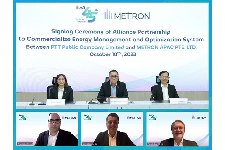 วานนี้ (18 ตุลาคม 2566) ม.ล. ปีกทอง ทองใหญ่ รองกรรมการผู้จัดการใหญ่หน่วยธุรกิจก๊าซธรรมชาติ บริษัท ปตท. จำกัด (มหาชน) (ปตท.) เป็นประธานในพิธีลงนามสัญญาความร่วมมือในธุรกิจแพลตฟอร์มบริหารจัดการพลังงาน (Energy Management Platform) ระหว่าง บริษัท ปตท. จำกัด (มหาชน) และ บริษัท เมตรอน เอเชียแปซิฟิก จำกัด (เมตรอน) โดยมี นางสุณี อารีกุล ผู้ช่วยกรรมการผู้จัดการใหญ่ตลาดค้าปลีกและวิศวกรรมก๊าซธรรมชาติ ปตท. และ Mr. Vincent Sciandra ประธานเจ้าหน้าที่บริหาร บริษัท เมตรอน เอเชียแปซิฟิก จำกัดเป็นผู้ลงนาม เพื่อขยายตลาดเอนเนอร์ยี่ โซลูชั่นส์ในประเทศไทย ด้วยเทคโนโลยี Advanced Energy Intelligence Platform เพิ่มขีดความสามารถในการแข่งขันของภาคอุตสาหกรรมไทย และตอบสนองนโยบายภาครัฐตามเป้าหมายความเป็นกลางทางคาร์บอน (Carbon Neutrality) และการปล่อยก๊าซเรือนกระจกสุทธิเป็นศูนย์ (Net Zero Emissions)
