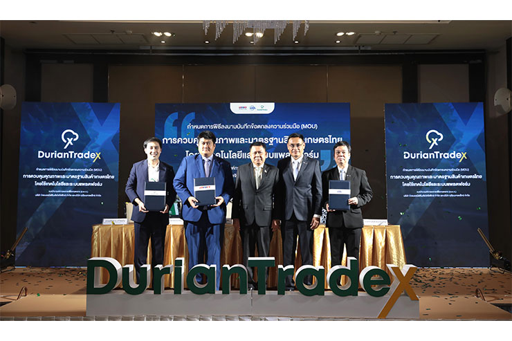 เมื่อเร็ว ๆ นี้ – นายประยูร อินสกุล ปลัดกระทรวงเกษตรและสหกรณ์ (กลาง) และนายชาญศักดิ์ ชื่นชม รองกรรมการผู้จัดการใหญ่วิศวกรรมและโครงสร้างพื้นฐาน บริษัท ปตท. จำกัด (มหาชน) และประธานกรรมการ บริษัท โกลบอล มัลติโมดัล โลจิสติกส์ จำกัด (ที่ 2 จากขวา) เป็นประธานร่วมในพิธีลงนามบันทึกข้อตกลงความร่วมมือการเพิ่มศักยภาพในการขยายตลาดและยืนยันแหล่งที่มาของสินค้าเกษตรไทยคุณภาพผ่านแพลตฟอร์ม DurianTradeX ระหว่าง บริษัท โกลบอล มัลติโมดัล โลจิสติกส์ จำกัด (GML) โดยนายไกรยสิทธิ์ อินทรพาณิชย์ กรรมการผู้จัดการใหญ่ (ขวาสุด) องค์การตลาดเพื่อเกษตรกร (อ.ต.ก.) โดยนายปณิธาน มีไชยโย ผู้อำนวยการ (ที่ 2 จากซ้าย) และบริษัท ทุเรียนเทรดเอ็กซ์ จำกัด โดยนายกิตติภูมิ ชินโสภณทรัพย์ ประธานกรรมการบริหาร (ซ้ายสุด) เพื่อเชื่อมโยงสินค้าเกษตรไทยที่ได้รับการรับรองคุณภาพจาก อ.ต.ก. สู่ตลาดส่งออก โดยใช้แพลตฟอร์ม DurianTradeX เป็นตัวกลางในการยืนยันคุณภาพสินค้าเกษตร และเป็นช่องทางการขาย ตลอดจนสร้างเครือข่ายด้านการขนส่งที่ส่งเสริมความพร้อมในการส่งออกมากยิ่งขึ้น นอกจากจะเพิ่มความเชื่อมั่นให้กับคู่ค้าทั่วโลก ยังช่วยส่งเสริมระบบตลาดสินค้าเกษตรออนไลน์ เพิ่มโอกาสทางการค้าให้กับเกษตรกรรายย่อยและผู้ประกอบการสินค้าเกษตร ในการส่งออกสินค้าไทยที่ได้มาตรฐานเป็นที่ยอมรับในระดับสากล พร้อมทั้งขับเคลื่อนประเทศไทยเป็นศูนย์กลางสินค้าเกษตรคุณภาพ และยุทธศาสตร์ทางโลจิสติกส์ที่สำคัญของภูมิภาคอาเซียน