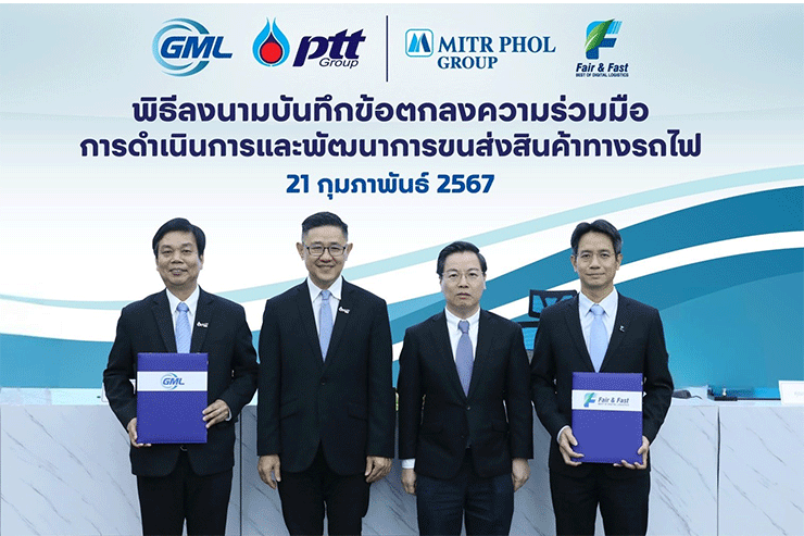เมื่อเร็ว ๆ นี้ - ดร.บุรณิน รัตนสมบัติ ประธานเจ้าหน้าที่ปฏิบัติการกลุ่มธุรกิจใหม่และโครงสร้างพื้นฐาน บริษัท ปตท. จำกัด (มหาชน) (ปตท.) (ที่ 2 จากซ้าย) และ นายวีระเจตน์ ว่องกุศลกิจ ประธานเจ้าหน้าที่บริหารกลุ่มธุรกิจน้ำตาลประเทศไทย พลังงานและธุรกิจใหม่ กลุ่มมิตรผล (ที่ 2 จากขวา) ร่วมเป็นประธานในพิธีลงนามบันทึกข้อตกลงความร่วมมือการดำเนินการและพัฒนาการขนส่งสินค้าทางรถไฟ ระหว่าง บริษัท โกลบอล มัลติโมดัลโลจิสติกส์ จำกัด (GML) ในกลุ่ม ปตท. และ บริษัท แฟร์ แอนด์ ฟาสต์ จำกัด (Fair & Fast) ผู้ให้บริการโลจิสติกส์ในกลุ่มมิตรผล โดยมี นายไกรยสิทธิ์ อินทรพาณิชย์ กรรมการผู้จัดการใหญ่ GML (ซ้ายสุด) นายอรุณ หัตถะรัชต์ กรรมการผู้จัดการ Fair & Fast (ขวาสุด) ร่วมลงนามความร่วมมือในการทำธุรกิจการขนส่งแบบมัลติโมดัลโลจิสติกส์ เพื่อพัฒนารูปแบบการขนส่งสินค้า ทางรถไฟ ทางถนน รวมถึงต่อเชื่อมทางรถไฟเข้าไปในท่าเทียบเรือ A4 แหลมฉบัง จ.ชลบุรี พร้อมบริหารจัดการคลังสินค้าและพื้นที่จัดเก็บตู้สินค้าภายในพื้นที่ท่าเทียบเรือและสถานีรถไฟทั่วประเทศ ซึ่งจะเป็นการยกระดับมาตรฐานระบบการคมนาคมขนส่งของประเทศไทยให้มีประสิทธิภาพมากยิ่งขึ้น พร้อมขับเคลื่อนเศรษฐกิจของประเทศอย่างยั่งยืนต่อไป
