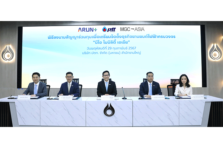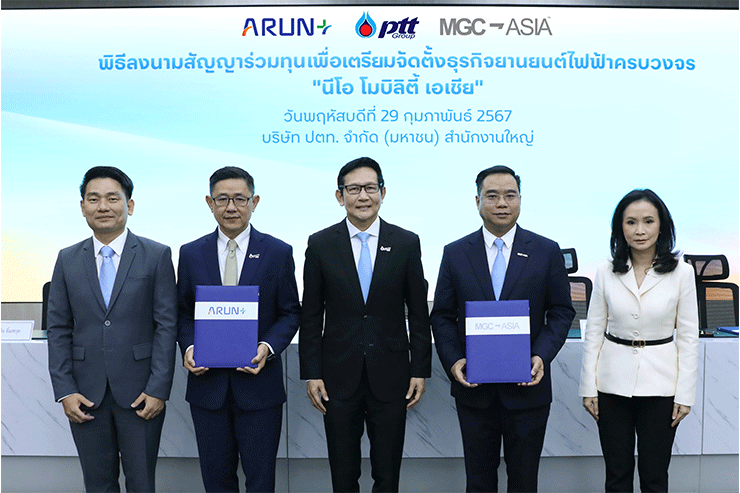 วันนี้ (29 กุมภาพันธ์ 2567) – นายอรรถพล ฤกษ์พิบูลย์ ประธานเจ้าหน้าที่บริหารและกรรมการผู้จัดการใหญ่ บริษัท ปตท. จำกัด (มหาชน) เป็นประธานในพิธีลงนามสัญญาเพื่อเตรียมจัดตั้งบริษัทร่วมทุน บริษัท นีโอ โมบิลิตี้ เอเชีย จำกัด (นีโอ โมบิลิตี้ เอเชีย) ระหว่าง กลุ่มบริษัทอรุณ พลัส และ กลุ่มบริษัท มิลเลนเนียม กรุ๊ป คอร์ปอเรชั่น (เอเชีย) จำกัด (มหาชน) (MGC-ASIA) เพื่อดำเนินธุรกิจจัดจำหน่ายยานยนต์ไฟฟ้าครบวงจรในประเทศไทย เช่น บริการสถานีอัดประจุไฟฟ้า บริการประกันภัย บริการสินเชื่อเช่าซื้อ ลีสซิ่ง สินเชื่อรีไฟแนนซ์และการเงินอย่างครบวงจร บริการให้เช่ายานยนต์ไฟฟ้า บริการหลังการขาย ศูนย์เช็คระยะ เปลี่ยนอะไหล่ ตลอดจนซ่อมสีและตัวถัง เป็นต้น โดยมี ดร.บุรณิน รัตนสมบัติ ประธานเจ้าหน้าที่ปฏิบัติการกลุ่มธุรกิจใหม่และโครงสร้างพื้นฐาน บริษัท ปตท. จำกัด (มหาชน) นายเอกชัย ยิ้มสกุล กรรมการผู้จัดการ บริษัท อรุณ พลัส จำกัด พร้อมด้วย ดร. สัณหวุฒิ ธรรมชวนวิริยะ ประธานเจ้าหน้าที่บริหารกลุ่มบริษัท มิลเลนเนียม กรุ๊ป คอร์ปอเรชั่น (เอเชีย) จำกัด (มหาชน) และนางสาวเจิดนภางค์ ธรรมชวนวิริยะ ประธานเจ้าหน้าที่สายงานการเงินและบัญชีกลุ่มบริษัท มิลเลนเนียม กรุ๊ป ร่วมลงนาม พร้อมด้วยผู้บริหารระดับสูงจาก ปตท. กลุ่ม อรุณ พลัส และ MGC-ASIA ร่วมเป็นสักขีพยาน