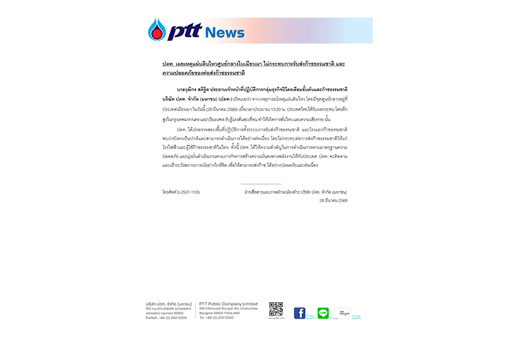 ปตท. เผยเหตุแผ่นดินไหวศูนย์กลางในเมียนมา ไม่กระทบการรับส่งก๊าซธรรมชาติ และความปลอดภัยของท่อส่งก๊าซธรรมชาติ