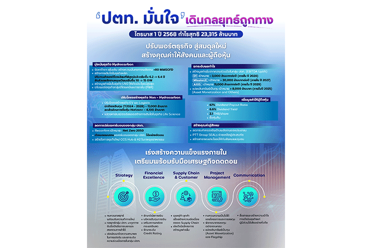 วันนี้ (21 พฤษภาคม 2568) – ดร.คงกระพัน อินทรแจ้ง ประธานเจ้าหน้าที่บริหารและกรรมการผู้จัดการใหญ่ บริษัท ปตท. จำกัด (มหาชน) (ปตท.) ปักหมุดความสำเร็จครบรอบ 1 ปี เดินหน้าตามวิสัยทัศน์ “ปตท. แข็งแรงร่วมกับสังคมไทยและเติบโตในระดับโลกอย่างยั่งยืน” เผยผลการดำเนินงานไตรมาส 1 ปี 2568 สะท้อนทิศทางการบริหารใน 2 เรื่องหลัก คือ เน้นธุรกิจ Hydrocarbon ที่ถนัด ปรับพอร์ตธุรกิจสู่สมดุลใหม่ และเร่งสร้างความแข็งแกร่งจากภายใน ส่งผลให้มีกำไรสุทธิ จํานวน 23,315 ล้านบาท นำส่งรายได้เข้ารัฐในรูปแบบภาษี จำนวน 7,256 ล้านบาท
