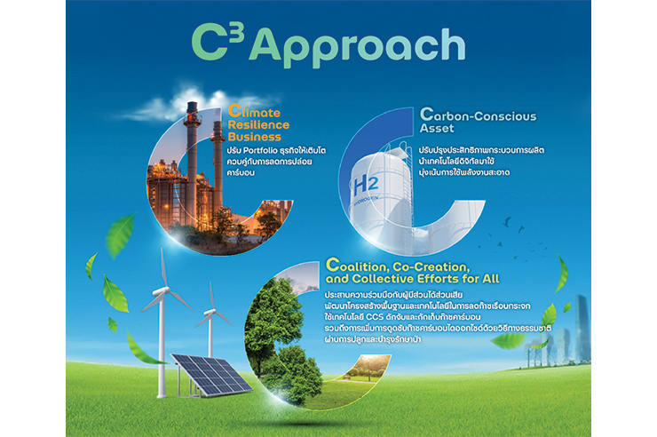 การดำเนินงานด้านความยั่งยืน กลุ่ม ปตท. ให้ความสำคัญกับการสร้างความมั่นคงทางพลังงาน สร้างการเติบโตทางธุรกิจควบคู่การลดการปล่อยก๊าซเรือนกระจก โดยดำเนินการอย่างบูรณาการร่วมกันทั้งกลุ่ม ปตท. ทั้งนี้ได้มีการ Reconfirm เป้าหมาย Net Zero 2050 และกำหนดแผนงานชัดเจน มีการพิจารณาปัจจัยรอบด้าน อาทิ ต้นทุนของการลดคาร์บอนด้วยวิธีต่างๆ เทียบกับค่าใช้จ่ายของการปล่อยคาร์บอน เช่น ภาษีคาร์บอนที่จะเกิดขึ้น โดยจะต้องมีความคุ้มค่าในการลงทุนเพื่อให้สามารถบรรลุเป้าหมายการลดคาร์บอนได้อย่างยั่งยืน ทั้งนี้ยังมีความก้าวหน้าในการศึกษาความเป็นไปได้ในการประยุกต์ใช้เทคโนโลยีดักจับและกักเก็บก๊าซคาร์บอนไดออกไซด์ (Carbon Capture and Storage: CCS) รวมถึงพัฒนา CCS Hub Model เพื่อสนับสนุนการลดการปล่อยก๊าซเรือนกระจกจากการดำเนินธุรกิจของกลุ่ม ปตท. ซึ่งจะเป็นต้นแบบสำคัญในการขยายผลเทคโนโลยี CCS ระดับประเทศในอนาคต สำหรับการศึกษาด้านธุรกิจไฮโดรเจนในภาคอุตสาหกรรมปัจจุบันอยู่ระหว่างการหารือกับพันธมิตรทั้งในด้านการจัดหาไฮโดรเจนและแอมโมเนียคาร์บอนต่ำ และการประยุกต์ใช้ในภาคการผลิตไฟฟ้าเพื่อเป็นต้นแบบในการขยายผลเชิงธุรกิจ ตลอดจนสนับสนุนแผนพัฒนากำลังผลิตไฟฟ้า (Power Development Plan: PDP) ของประเทศไทยในอนาคต