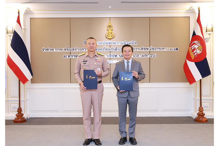 เมื่อเร็วๆ นี้ – พลเรือเอก จิรพล ว่องวิทย์ ผู้บัญชาการทหารเรือ (ซ้าย) และ ดร.คงกระพันอินทรแจ้ง ประธานเจ้าหน้าที่บริหารและกรรมการผู้จัดการใหญ่ บริษัท ปตท. จำกัด (มหาชน) (ปตท.) (ขวา) ร่วมลงนามในบันทึกความร่วมมือว่าด้วย การเสริมสร้างความปลอดภัยแก่เส้นทางการขนส่งพลังงานทางทะเล ระหว่างกองทัพเรือ และ บริษัท ปตท. จำกัด (มหาชน) เพื่อร่วมพัฒนาและส่งเสริมกลไกการประสานงานที่เกี่ยวข้องกับการรักษาความปลอดภัยแก่เส้นทางการขนส่งพลังงานทางทะเล ครอบคลุมเส้นทางนำเข้าและส่งออกของประเทศ โดยมุ่งเน้นการรวบรวมและแลกเปลี่ยนข้อมูลข่าวสารระหว่างกองทัพเรือและ ปตท. รวมถึงหน่วยงานราชการและภาคเอกชนอื่นๆ ที่เกี่ยวข้องอย่างรวดเร็วและมีประสิทธิภาพ พร้อมทั้งวิเคราะห์และประเมินสถานการณ์ที่อาจส่งผลกระทบต่อเส้นทางการขนส่ง นับเป็นอีกก้าวสำคัญในการยกระดับมาตรการรักษาความปลอดภัยด้านพลังงานทางทะเล เสริมศักยภาพพันธกิจในการรักษาความมั่นคงทางพลังงานของประเทศอย่างยั่งยืน