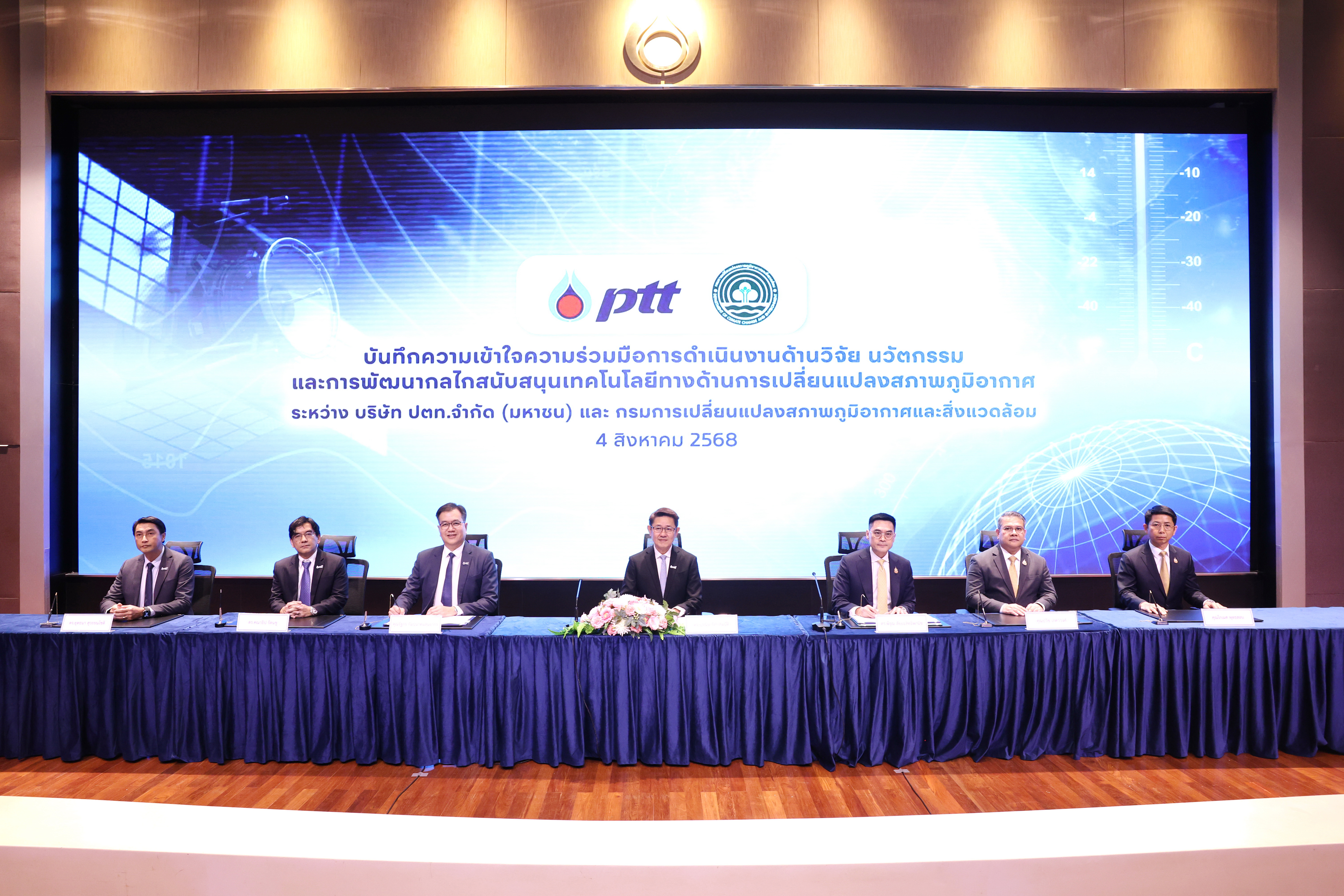 วานนี้ (4 สิงหาคม 2568) – บริษัท ปตท. จำกัด (มหาชน) (ปตท.) และ กรมการเปลี่ยนแปลงสภาพภูมิอากาศและสิ่งแวดล้อม (สส.) ร่วมลงนามบันทึกความเข้าใจความร่วมมือการดำเนินงานด้านวิจัย นวัตกรรม และการพัฒนากลไกสนับสนุนเทคโนโลยีทางด้านการเปลี่ยนแปลงสภาพภูมิอากาศ โดยมี ดร.บุรณิน รัตนสมบัติ ประธานเจ้าหน้าที่ปฏิบัติการกลุ่มธุรกิจใหม่และความยั่งยืน ปตท. และ ดร.พิรุณ สัยยะสิทธิ์พานิช อธิบดีกรมการเปลี่ยนแปลงสภาพภูมิอากาศและสิ่งแวดล้อม ร่วมเป็นประธานในพิธี โดยความร่วมมือครั้งนี้จะมุ่งเน้นการแลกเปลี่ยน และเสริมสร้างความร่วมมือด้านข้อมูล องค์ความรู้ งานวิจัยและนวัตกรรม รวมถึงการพัฒนากลไกสนับสนุนเทคโนโลยีทางด้านการเปลี่ยนแปลงสภาพภูมิอากาศ อาทิ การพัฒนาโครงการการดักจับและกักเก็บคาร์บอนไดออกไซด์ การพัฒนาโครงการเทคโนโลยีไฮโดรเจน และอนุพันธ์ของไฮโดรเจน ตลอดจนเทคโนโลยีอื่นๆ ที่เกี่ยวข้อง เพื่อร่วมผลักดันการลดการปล่อยก๊าซเรือนกระจกของประเทศไทย ให้บรรลุเป้าหมายการปล่อยก๊าซเรือนกระจกสุทธิเป็นศูนย์ (Net Zero Emissions) และขับเคลื่อนประเทศสู่ความยั่งยืนในระดับสากลการลงนามในบันทึกความเข้าใจครั้งนี้ ดร.พิรุณ สัยยะสิทธิ์พานิช อธิบดีกรมการเปลี่ยนแปลงสภาพภูมิอากาศและสิ่งแวดล้อม ได้ลงนามร่วมกับนายรัฐกร กัมปนาทแสนยากร รองกรรมการผู้จัดการใหญ่ความยั่งยืนองค์กร ปตท. โดยมีนายปวิช เกศววงศ์ และ นายโกเมศ พุทธสอน รองอธิบดีกรมการเปลี่ยนแปลงสภาพภูมิอากาศและสิ่งแวดล้อม เป็นสักขีพยานในพิธีด้วย