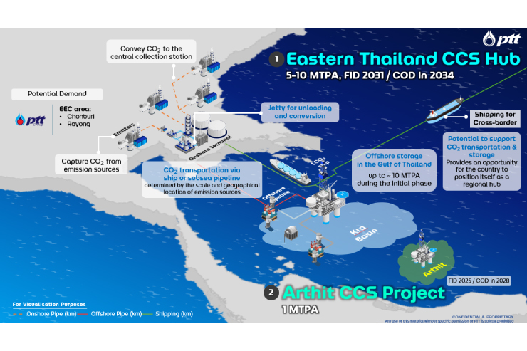 ในด้านการขับเคลื่อนความยั่งยืน  ปตท. ยังคงมุ่งมั่นในการบรรลุเป้าหมาย Net Zero ภายในปี 2050 และจะลดการปล่อยก๊าซเรือนกระจกให้ได้ 15% ในปี 2035 โดยดำเนินการอย่างสมดุลในทุกมิติ ทั้ง เศรษฐกิจ สังคม และสิ่งแวดล้อม โดยหารือร่วมกับหน่วยงานภาครัฐ เพื่อกำหนดแนวทางส่งเสริมและผลักดันเทคโนโลยีดักจับและกักเก็บคาร์บอนไดออกไซด์ (CCS) ให้เกิดการใช้งานจริงในไทย พร้อมทั้งศึกษาและนำเสนอความเป็นไปได้ของการใช้ Hydrogen และ Ammonia Co-firing เป็นพลังงานทางเลือกในประเทศ ทั้งนี้ โครงการ CCS ที่แหล่งอาทิตย์ในอ่าวไทยจะเริ่มดักจับและกักเก็บคาร์บอนไดออกไซด์ในปี 2571 โดยสามารถกักเก็บได้สูงสุดประมาณ 1 ล้านตันต่อปี โครงการดังกล่าวจะเป็นต้นแบบสำคัญสำหรับการพัฒนา CCS ในพื้นที่อื่น ๆ ของประเทศไทย รวมถึงการพัฒนา CCS Hub ในเขตพัฒนาพิเศษภาคตะวันออกในอนาคต