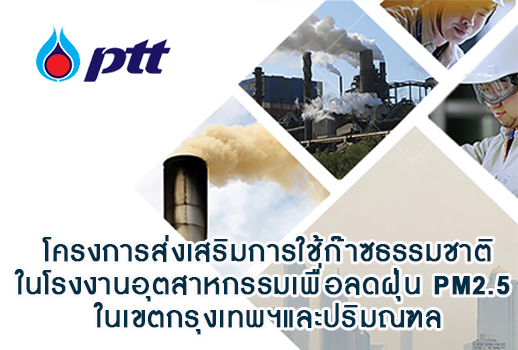 ปตท. ร่วมแก้ปัญหาฝุ่น PM 2.5 จัดทีมสำรวจโรงงานในเขตกรุงเทพฯ และปริมณฑล ให้บริการตรวจสภาพเครื่องจักรด้วย “โครงการส่งเสริมการใช้ก๊าซธรรมชาติในโรงงานอุตสาหกรรม” พร้อมให้คำปรึกษาเพื่อปรับปรุงประสิทธิภาพการเผาไหม้เชื้อเพลิง และสนับสนุนปรับเปลี่ยนใช้พลังงานสะอาด ตั้งแต่วันนี้ ถึง 31 มีนาคม 2563 นายวุฒิกร สติฐิต รองกรรมการผู้จัดการใหญ่หน่วยธุรกิจก๊าซธรรมชาติ บริษัท ปตท. จำกัด (มหาชน) (ปตท.) เปิดเผยว่า จากสถานการณ์ค่าฝุ่นละอองขนาดเล็ก PM 2.5 เกินมาตรฐาน ปตท. มีความห่วงใยต่อสถานการณ์ดังกล่าวมาโดยตลอด หน่วยธุรกิจก๊าซฯ ปตท. จึงริเริ่ม “โครงการส่งเสริมการใช้ก๊าซธรรมชาติในโรงงานอุตสาหกรรมเพื่อลดฝุ่นละออง PM 2.5 ในเขตกรุงเทพมหานครและปริมณฑล” เป็นครั้งแรก ด้วยเล็งเห็นถึงโอกาสในการสนับสนุนให้ผู้ประกอบการโรงงานอุตสาหกรรมหันมาใช้พลังงานสะอาด และปรับปรุงประสิทธิภาพกระบวนการทำงานของเครื่องจักร ซึ่งจะเป็นส่วนหนึ่งในการร่วมแก้ไขและป้องกันปัญหาดังกล่าว ในระยะยาว
