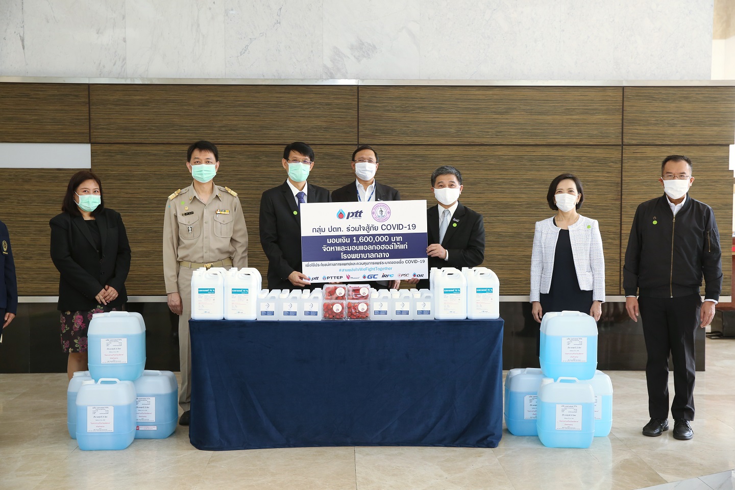 เมื่อเร็วๆ นี้ – นายอธิคม เติบศิริ ประธานเจ้าหน้าที่ปฏิบัติการกลุ่มธุรกิจปิโตรเลียมขั้นต้นและก๊าซธรรมชาติ (ที่ 3 จากขวา) นายวิทวัส สวัสดิ์-ชูโต ประธานเจ้าหน้าที่เทคโนโลยีและวิศวกรรม (กลาง) พร้อมด้วยคณะผู้บริหาร บริษัท ปตท. จำกัด (มหาชน) เป็นผู้แทน ปตท. ร่วมมอบเงิน 1.6 ล้านบาท สำหรับจัดซื้ออุปกรณ์ทางการแพทย์ พร้อมทั้งแอลกอฮอล์ที่จัดหาได้จากโรงงานผู้ผลิตในประเทศ เนื่องจาก ปตท. ไม่มีโรงงานผลิตแอลกอฮอล์เป็นของตนเอง และยังจัดซื้อเพิ่มเติมในรูปแบบเจล และสเปรย์ เพื่อมอบให้แก่โรงพยาบาลกลาง โดยนายแพทย์เพชรพงษ์ กำจรกิจการ ผู้อำนวยการโรงพยาบาล (ที่ 3 จากซ้าย) เป็นผู้รับมอบ เพื่อนำไปใช้ดูแลรักษาประชาชนให้ปลอดภัยจากการแพร่ระบาดของเชื้อไวรัส COVID -19 นอกจากนี้ กลุ่ม ปตท. ยังได้นำสตรอว์เบอร์รี Harumiki ที่ปลูกโดยใช้พลังความเย็นจากกระบวนการแปรสภาพก๊าซธรรมชาติเหลว (LNG) มามอบให้เป็นกำลังใจอีกด้วย กลุ่ม ปตท. พร้อมเป็นกำลังใจให้ผ่านวิกฤตครั้งนี้ไปด้วยกัน #สานพลังใจWeFightTogether