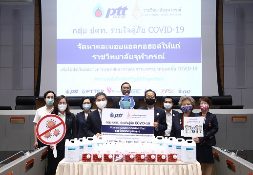นายอธิคม เติบศิริ ประธานเจ้าหน้าที่ปฏิบัติการกลุ่มธุรกิจปิโตรเลียมขั้นต้นและก๊าซธรรมชาติ นางสาวพรรณนลิน มหาวงศ์ธิกุล ประธานเจ้าหน้าที่บริหารการเงิน นายวิทวัส สวัสดิ์-ชูโต ประธานเจ้าหน้าที่เทคโนโลยีและวิศวกรรม บริษัท ปตท. จำกัด (มหาชน) จัดหาและมอบแอลกอฮอล์ทั้งในรูปแบบเจลและสเปรย์ จากผู้ผลิต เนื่องจาก ปตท. ไม่มีโรงงานผลิตแอลกอฮอล์เป็นของตนเอง พร้อมสตรอว์เบอร์รี Harumiki ที่ปลูกโดยใช้ความเย็นจากกระบวนการแปรสภาพก๊าซธรรมชาติเหลว (LNG) ให้แก่โรงพยาบาลจุฬาภรณ์ และสถาบันบัณฑิตศึกษาจุฬาภรณ์ โดยนายณวลฺลภ ยุติธรรมดำรง รองเลขาธิการ ราชวิทยาลัยจุฬาภรณ์ ด้านบริหาร ศ.พญ.จิรพร เหล่าธรรมทัศน์ คณบดี คณะเทคโนโลยีวิทยาศาสตร์สุขภาพ วิทยาลัยวิทยาศาสตร์การแพทย์เจ้าฟ้าจุฬาภรณ์ ราชวิทยาลัยจุฬาภรณ์ เป็นผู้รับมอบ เพื่อสนับสนุนการทำงาน พร้อมเป็นกำลังใจแก่บุคลากรทางการแพทย์ในการดูแลสุขภาพประชาชน และควบคุมการแพร่ระบาดของโรค COVID-19 กลุ่ม ปตท. พร้อมเป็นกำลังใจให้ผ่านวิกฤตครั้งนี้ไปด้วยกัน #สานพลังใจWeFightTogether