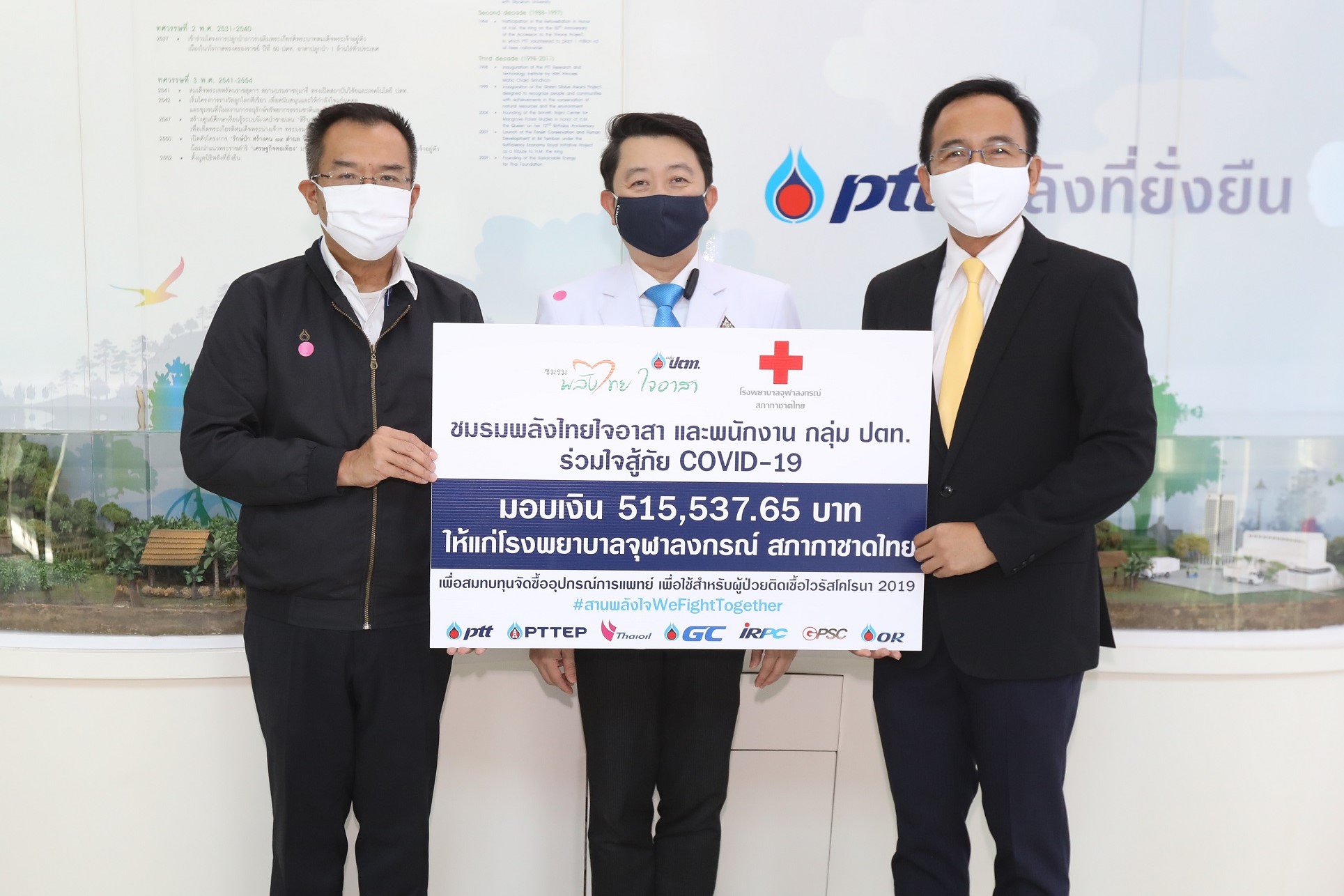 นายนพดล ปิ่นสุภา รองกรรมการผู้จัดการใหญ่ ในฐานะประธาน “ชมรมพลังไทย ใจอาสา กลุ่ม ปตท.” พร้อมด้วย นายวุฒิกร สติฐิต รองกรรมการผู้จัดการใหญ่หน่วยธุรกิจก๊าซธรรมชาติ บริษัท ปตท. จำกัด (มหาชน) เป็นผู้แทนมอบเงินที่ผู้บริหารและพนักงานกลุ่ม ปตท. ร่วมกันบริจาคจำนวน 515,537.65 บาท แก่ โรงพยาบาลจุฬาลงกรณ์ สภากาชาดไทย โดยมี ผู้ช่วยศาสตราจารย์ (พิเศษ) นายแพทย์ สุรินทร์ อัศววิทูรทิพย์ ผู้ช่วยผู้อำนวยการฯ ด้านภาพลักษณ์องค์กร (กลาง) เป็นผู้แทนรับมอบ เพื่อนำเงินบริจาคดังกล่าวไปสมทบทุนในการจัดซื้ออุปกรณ์ทางการแพทย์สำหรับผู้ป่วยติดเชื้อไวรัสโควิด-19 ต่อไปกลุ่ม ปตท. พร้อมเป็นกำลังใจให้ผ่านวิกฤตครั้งนี้ไปด้วยกัน #สานพลังใจWeFightTogether