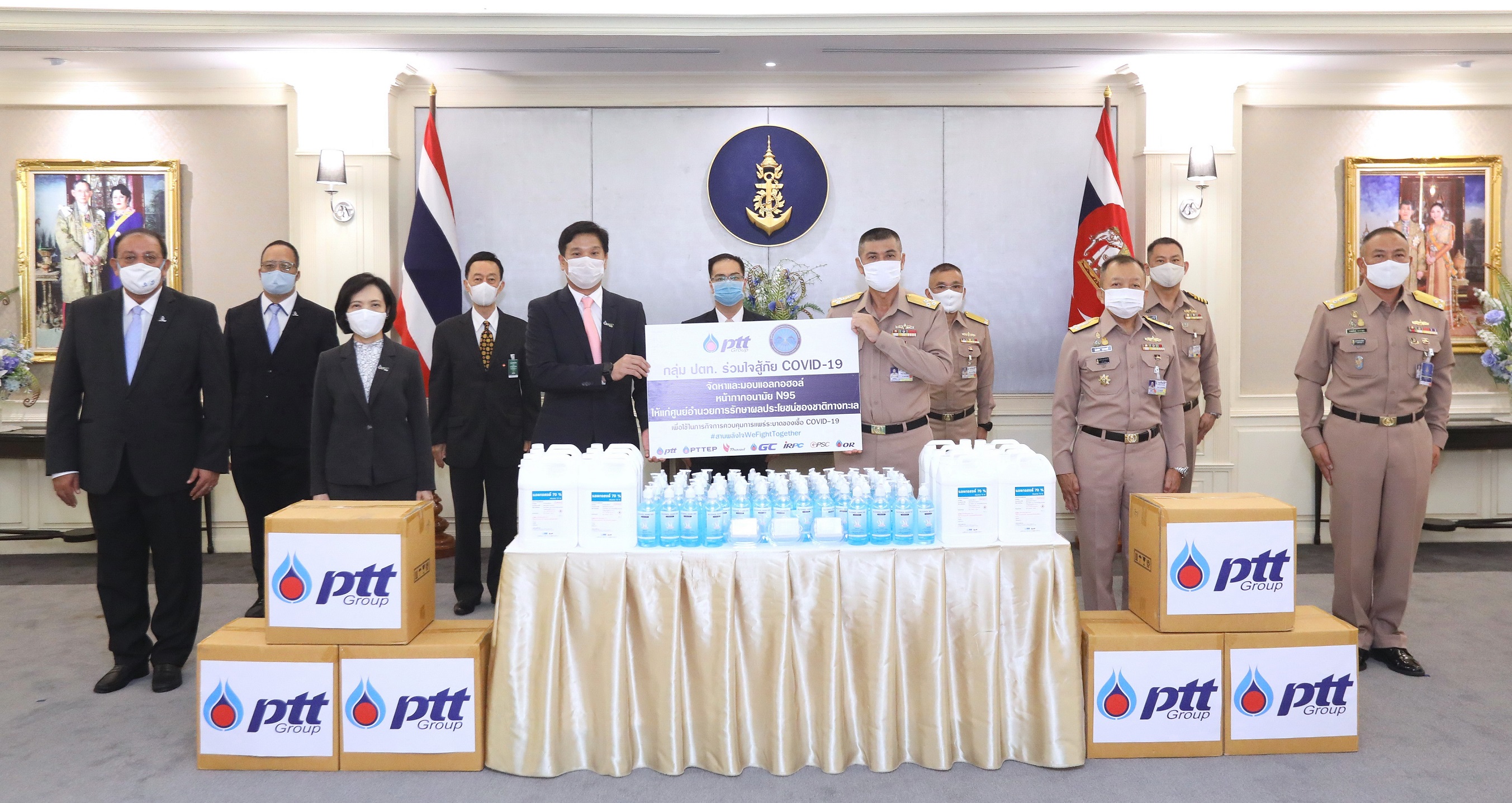 วันนี้ (5 พฤษภาคม 2563) – นายดิษทัต ปันยารชุน รองกรรมการผู้จัดการใหญ่หน่วยธุรกิจการค้าระหว่างประเทศ (ที่ 1 จากซ้าย) พร้อมด้วย นางสาวดวงพร เที่ยงวัฒนธรรม รองกรรมการผู้จัดการใหญ่กำกับดูแลองค์กรและกิจการสัมพันธ์ (ที่ 1 จากขวา) บริษัท ปตท. จำกัด (มหาชน) มอบเจลแอลกอฮอล์ ซึ่งจัดหาจากผู้ผลิตในประเทศ เนื่องจาก ปตท. ไม่มีโรงงานผลิตแอลกอฮอล์เป็นของตนเอง ทั้งนี้ บริษัท ปตท.สำรวจและผลิตปิโตรเลียม จำกัด (มหาชน) ยังได้ร่วมมอบหน้ากากอนามัย N95 ให้แก่ศูนย์อำนวยการรักษาผลประโยชน์ของชาติทางทะเล (ศรชล.) กองทัพเรือ โดย พล.ร.อ.