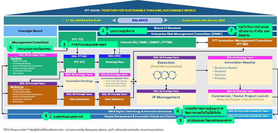 - การบริหารจัดการนวัตกรรมในลักษณะของ Bottom-UP โดยมีคณะกรรมการ PTT Innovation Management Committee (PTT IMC) เป็นคณะกรรมการหลักในการบริหารจัดการลักษณะของ Cross Functional มีผู้แทนจากแต่ละสายงานที่เกี่ยวข้องเข้าร่วมเป็นคณะกรรมการเพื่อสนับสนุนและส่งเสริมการพัฒนานวัตกรรมในส่วนของ Bottom-Up และช่วยติดตามความก้าวหน้าของการพัฒนานวัตกรรมในลักษณะของ Top-Down โดยผลการดำเนินงานจะได้รับการติดตาม ให้คำแนะนำ และกำกับดูแลจาก PTT MC และ ERMC เพื่อให้การบริหารจัดการนวัตกรรมภายใน ปตท. เป็นไปอย่างมีประสิทธิภาพ และได้ผลลัพธ์ของการดำเนินงานตามเป้าหมายที่กำหนด